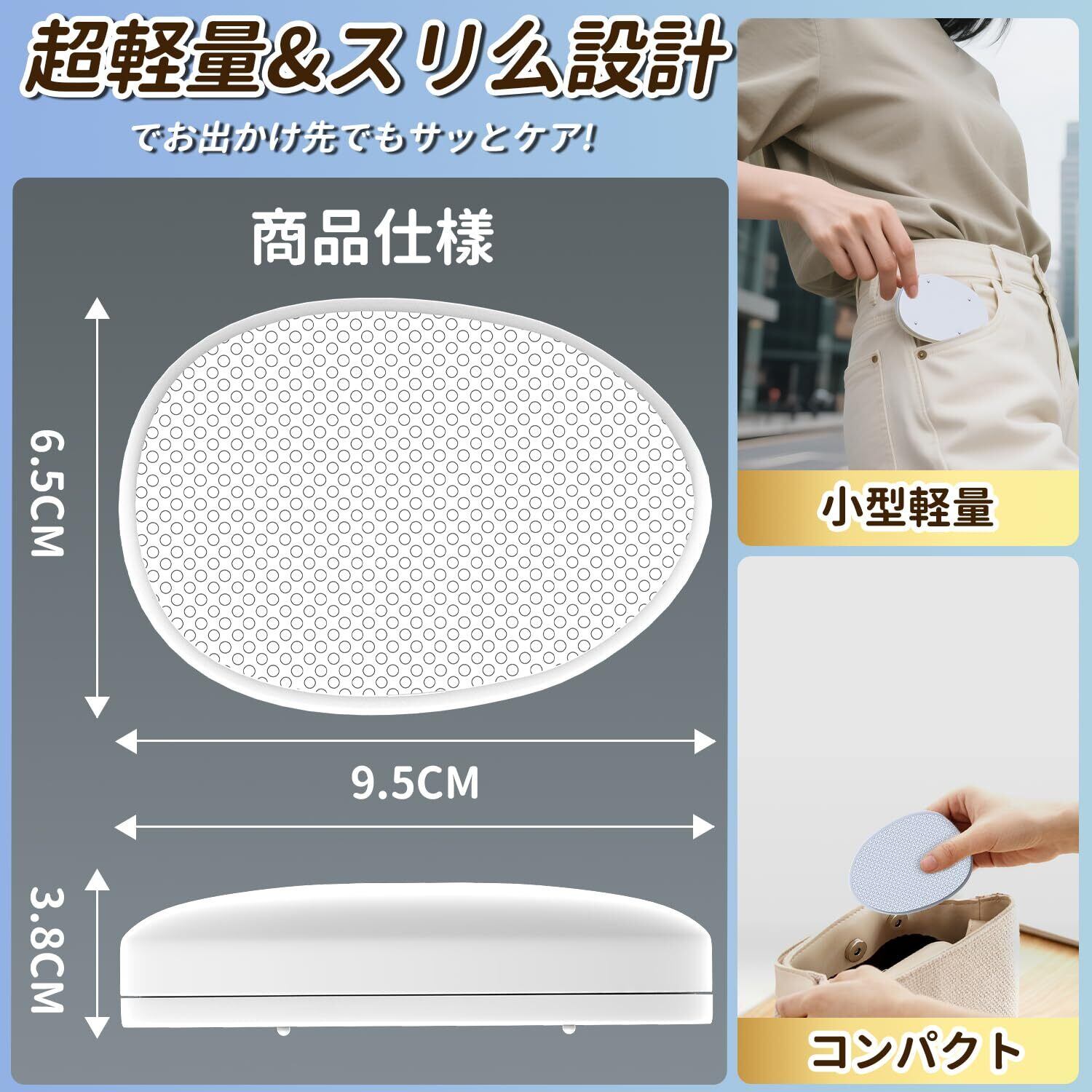使用材料にはエコに配慮した素材を採用し、環境にも優しい設計となっています。軽量ながらもしっかりとした作りで、出張や旅行にも最適です。持ち運び便利なので、どこでも手軽にケアができます。