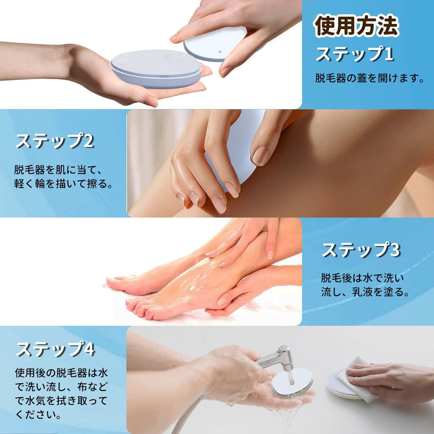 【使用簡単】 ① 脱毛したい部位を軽く拭いて清潔にします→② 脱毛器を対象部位に当て、軽く前後に、または円を描くように摩擦します→③ 脱毛後は、水で優しく洗い流すか、湿ったタオルでふき取ります→④ 使用後は、脱毛器に付着した毛や角質を水で洗い流し、乾燥した場所で保管してください。