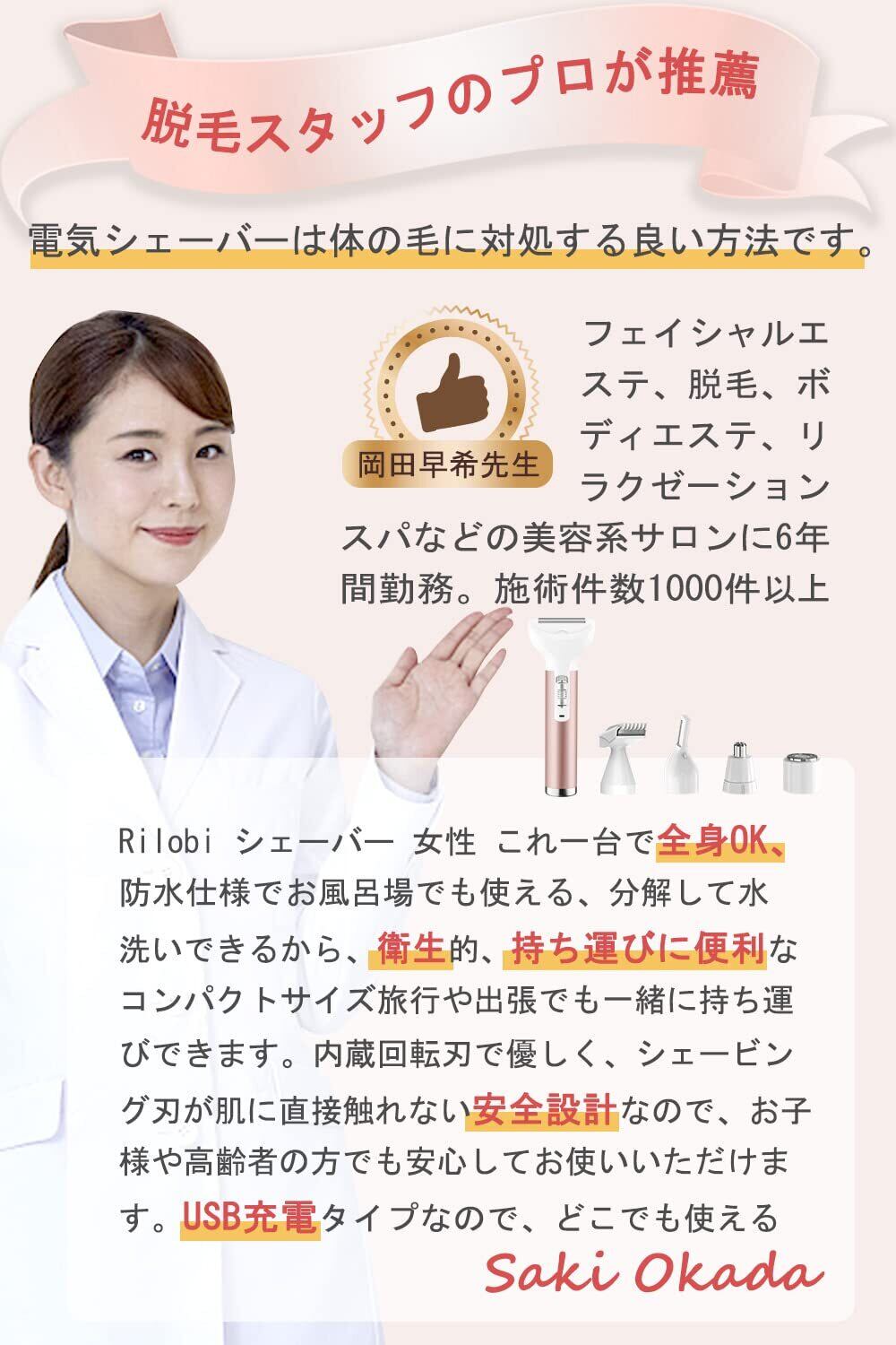 【5In1 電気 シェーバー 女性& 全身適用】Rilobi 電動 シェーバー は VIO専用シェーバー、ボディーシェーバー、顔用シェーバー、鼻毛カッター、眉毛カッターなど5つの機能がある充電式の全身脱毛シェーバーです。 顔、脇、足、腕、ビキニライン、デリケートゾーン、下の毛、眉毛、鼻毛、耳毛などの全身のムダ毛を処理できます。光美容器前、脱毛サロン前にもおすすめ! おすすめされていて、脱毛のスタッフによるとムダ毛の処理に良い方法といわれている「電気シェーバー」。