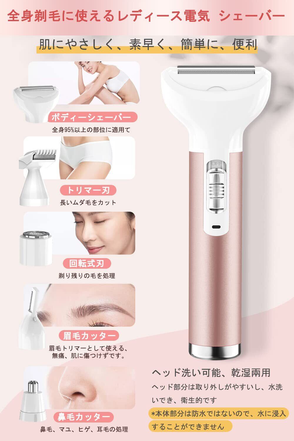 【肌にやさしい&5つのヘッド交換が簡単 】レディースシェーバーは高品質のアレルギー防止ステンレス刃を使っており、肌デリケートな部分の処理も肌に負担をかけずに処理することができます。独特丸い刃先で肌にやさしい。約0.12 mmのうす刃で根元からカット。肌の凹凸に合わせて動く密着スイングヘッドで肌にやさしくシェービング。肌を傷めずに、やさしく深剃りが可能です。5つのヘッドの付け替えがすごい簡単で使いやすいです!効果的に長い毛、短い毛、クセ毛またはムダ毛の根元から取り除けます。(暖かいヒント:電気シェーバーを使用した後は、必ず保湿ケアすることをおすすめします。普段お使いの化粧水や乳液で良いので、忘れずに保湿をするようにしてください。)