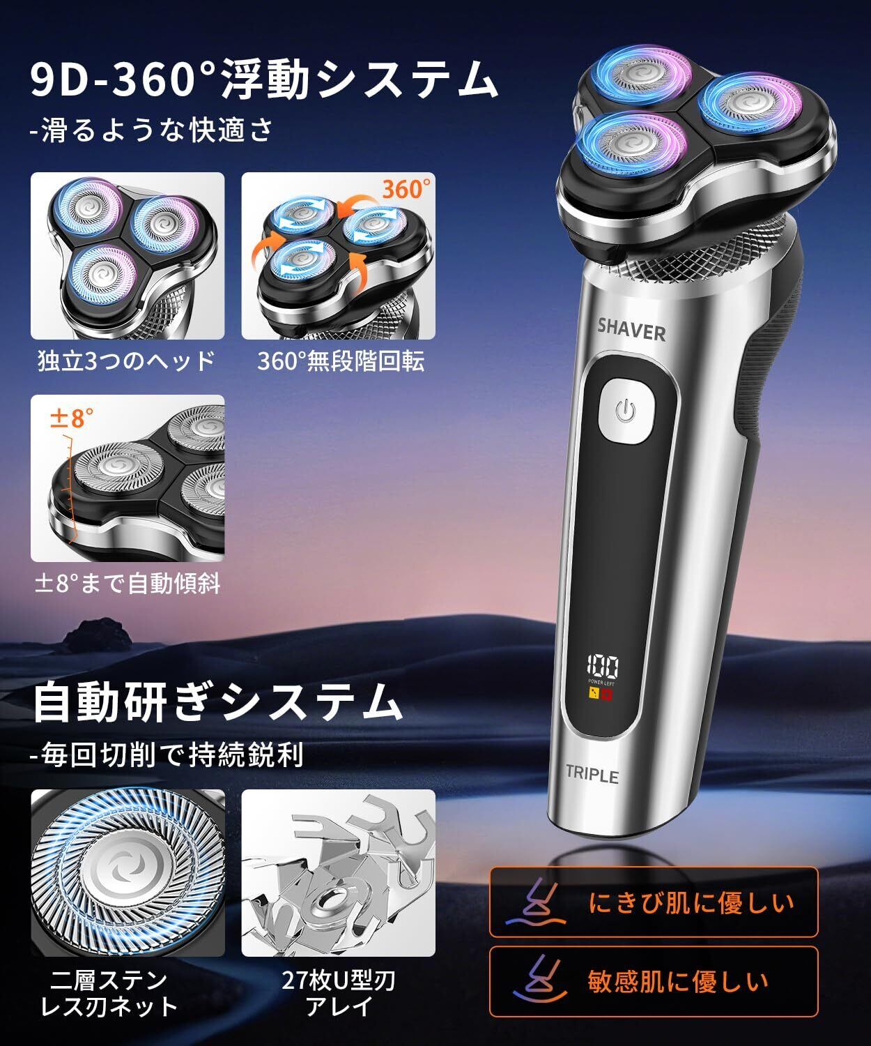 自動研磨&2段階速度調節 3つの独立丸型外刃+二重剃刀ネット+U字精密刃27枚を搭載しています。自動研磨技術で切れ味を持続させます。2段階調整機能:低速モードで敏感ゾーンを優しく整え、高速で固いヒゲも時短処理します。一度で青髭痕を残さず、敏感肌でもシルクのような刺激ゼロ体験を実現します。朝の身だしなみ効率が50%向上します!ユーザーの92%が「赤みなし、あごのカーブにもフィットします」と実感しています。