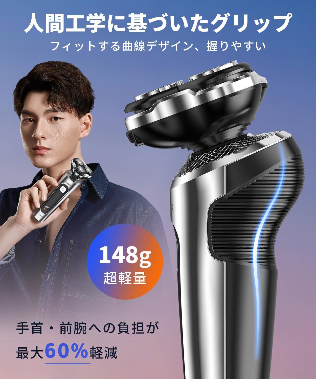 ️人間工学設計&軽量便利️ ひげそり の人体工学的なハンドル設計で、手の自然な握持姿勢にフィットし、重量はわずか 148g です。しっかりと握れて滑りにくく、長時間使用しても手が疲れず、操作が灵活です。ドライシェービングでもウェットシェービングでも、楽にコントロールでき、手の疲れを軽減し、快適な剃り体験を提供します。初心者/男子高校生でも簡単に操作でき、剃りの安全性を高め、安心して使用できる体験を提供します。