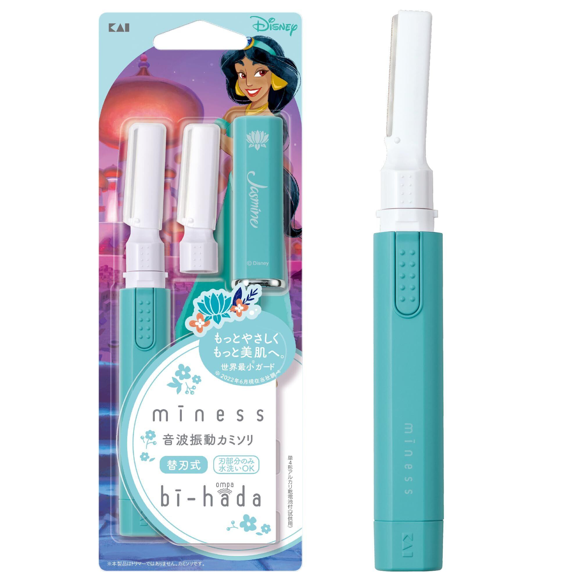 【ディズニープリンセスの限定デザイン】 敏感肌にもやさしいminessのフェイス用音波振動カミソリbi-hada ompa L (替刃2個付)。まるでなでるような感覚で剃ることができます。「ジャスミン」をイメージした数量限定のデザイン。ワンポイントモチーフで大人の女性でも使いやすいデザインです。