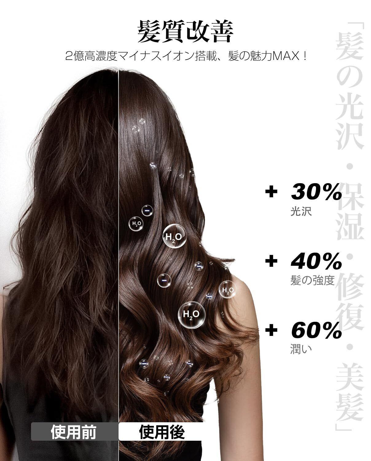 【2億高濃度マイナスイオンでツヤとサラサラ感を徹底サポート】マイナスイオン技術が髪の静電気や絡みつきを防止し、ツヤとサラサラ感をキープ!!毎日の使用で髪のダメージを軽減し、健康的な美しい髪へと導きます。