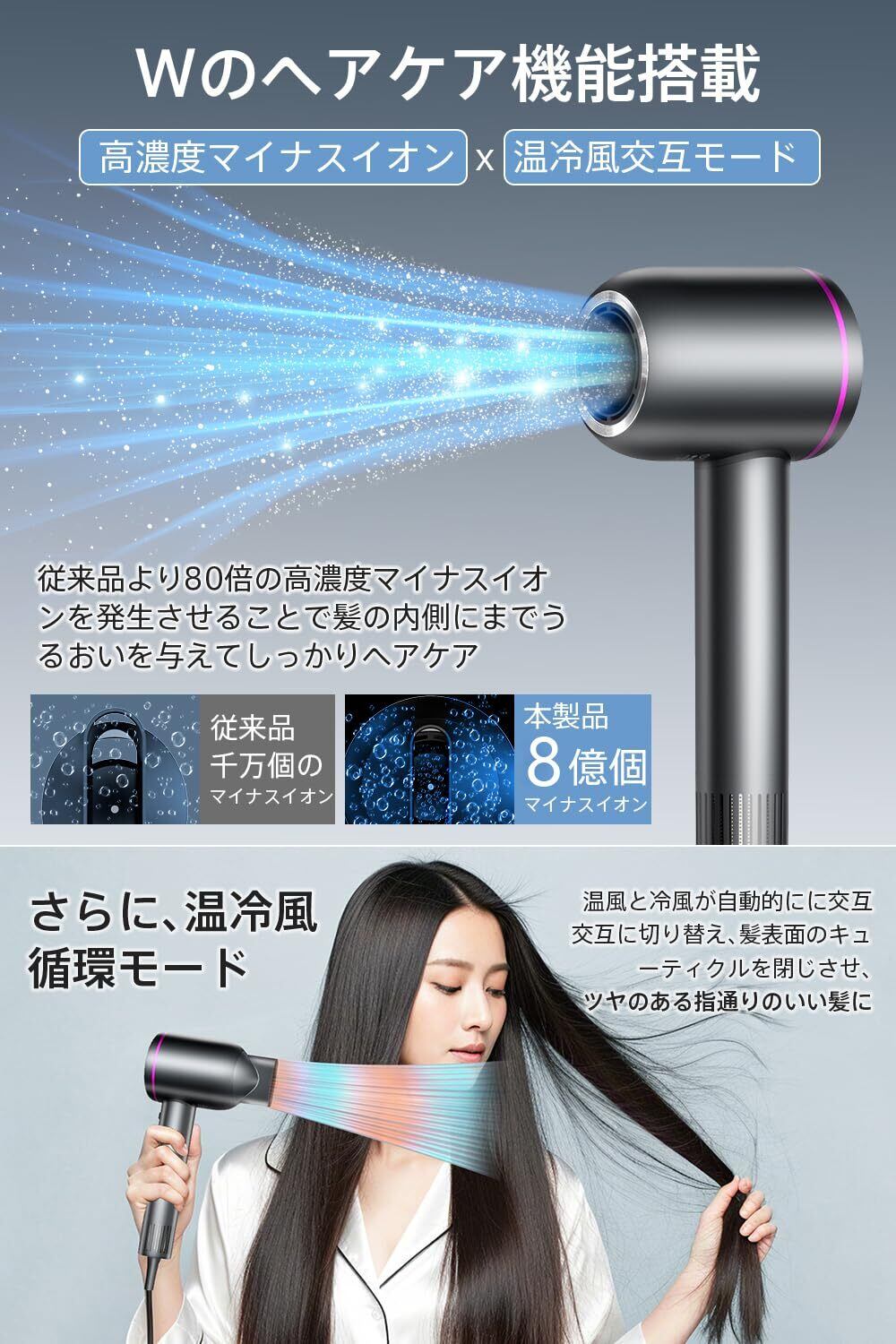 【ヘアケア機能搭載&自宅でもサロン帰りの髪を仕上げ!】8億個マイナスイオン放出&温冷風自動切替モードの2重ヘアケア機能搭載して、 どらいやーは速乾のだけでなく、髪のパサつきや癖、縮毛、まとわりの悪さなどの改善に役立ちます。従来の千万個レベルのマイナスイオンドライヤーより、80倍のマイナスイオン(8億個/秒)を放出し、髪の奥まで潤いを届け、静電気を抑制します。温冷風自動切替で、乾かすとともにキューティクルが整い、ツヤとまとまりのある美しい髪へと導きます。自宅でもサロン級の仕上がりを叶える大風量 ドライヤーがおすすめです。