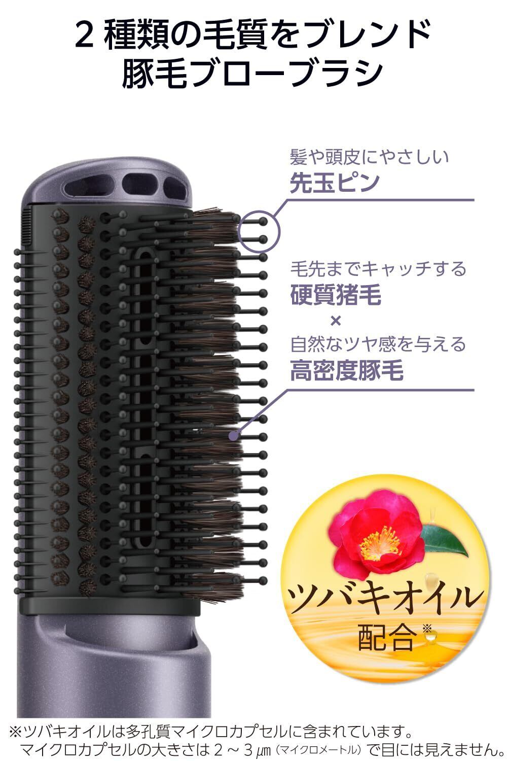 豚毛ブローブラシの黒色部分全面(ブラシセンター3列とブラシベース)にツバキオイルを配合したマイクロカプセルを含ませています。