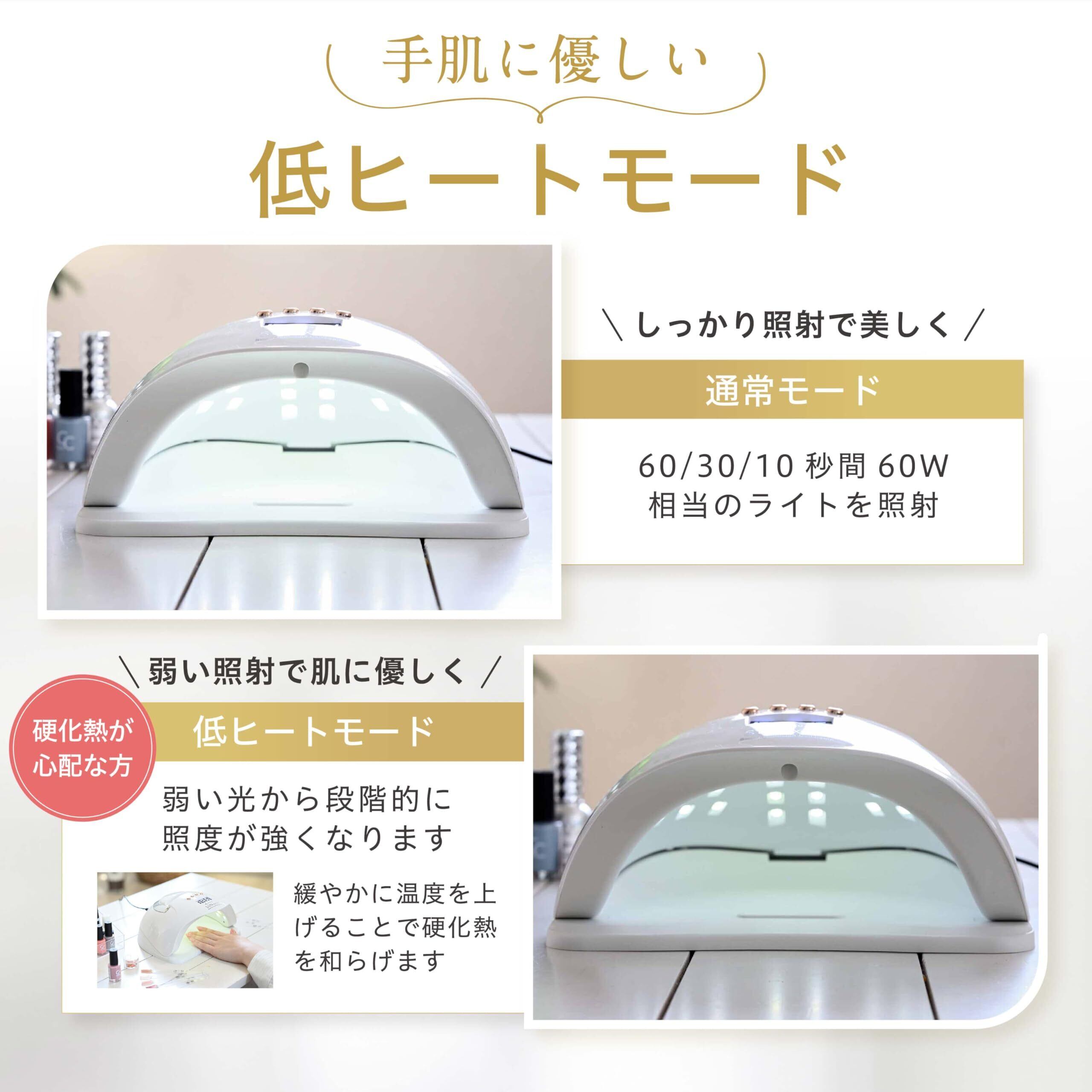 低ヒートモードを搭載しており、暗い場所でも安心して使用できます。急激な温度上昇を抑え、爪や肌に優しい仕様となっています。