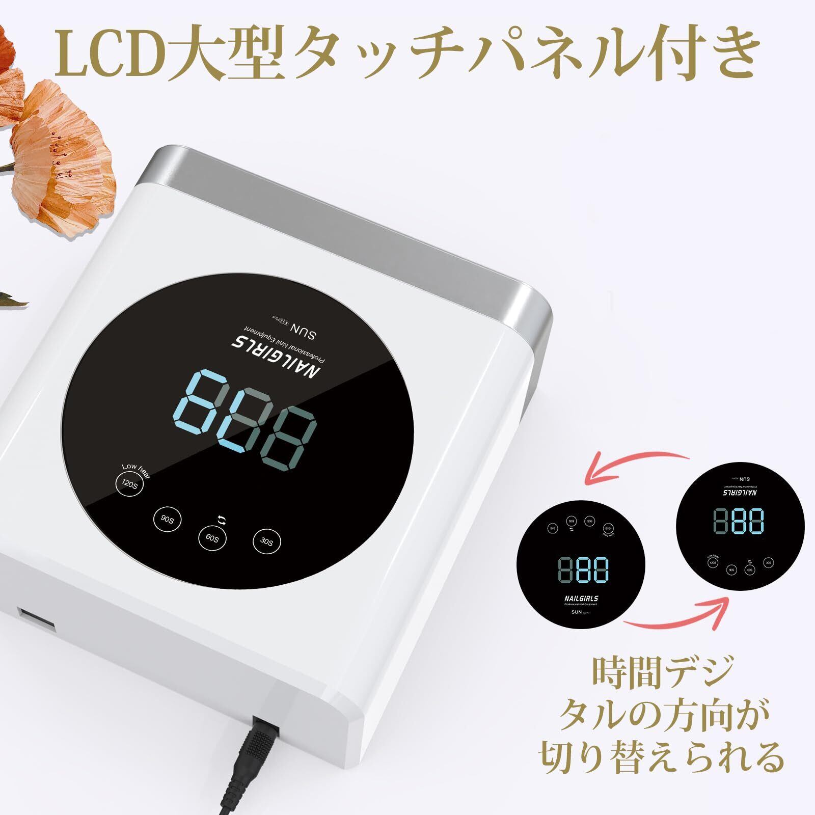 【LCD ディスプレイ&スマート赤外線センサー】当社のワイヤレス UV LED ネイルランプは、フルタッチの LCD ディスプレイを備え、4 つのタイマーオプション(30秒、60 秒、90 秒、120 秒の無痛低熱モード)があり、特定のニーズに応えます。また、ジェルポリッシュ用のネイルドライヤーは赤外線センサーライトも装備されており、手をライトに入れると自動的に点灯し、出ると消灯します。デジタル反転ボタンにより、お客様とネイル技術者は同時に画面の時間を確認でき、技術感がより強くなります。