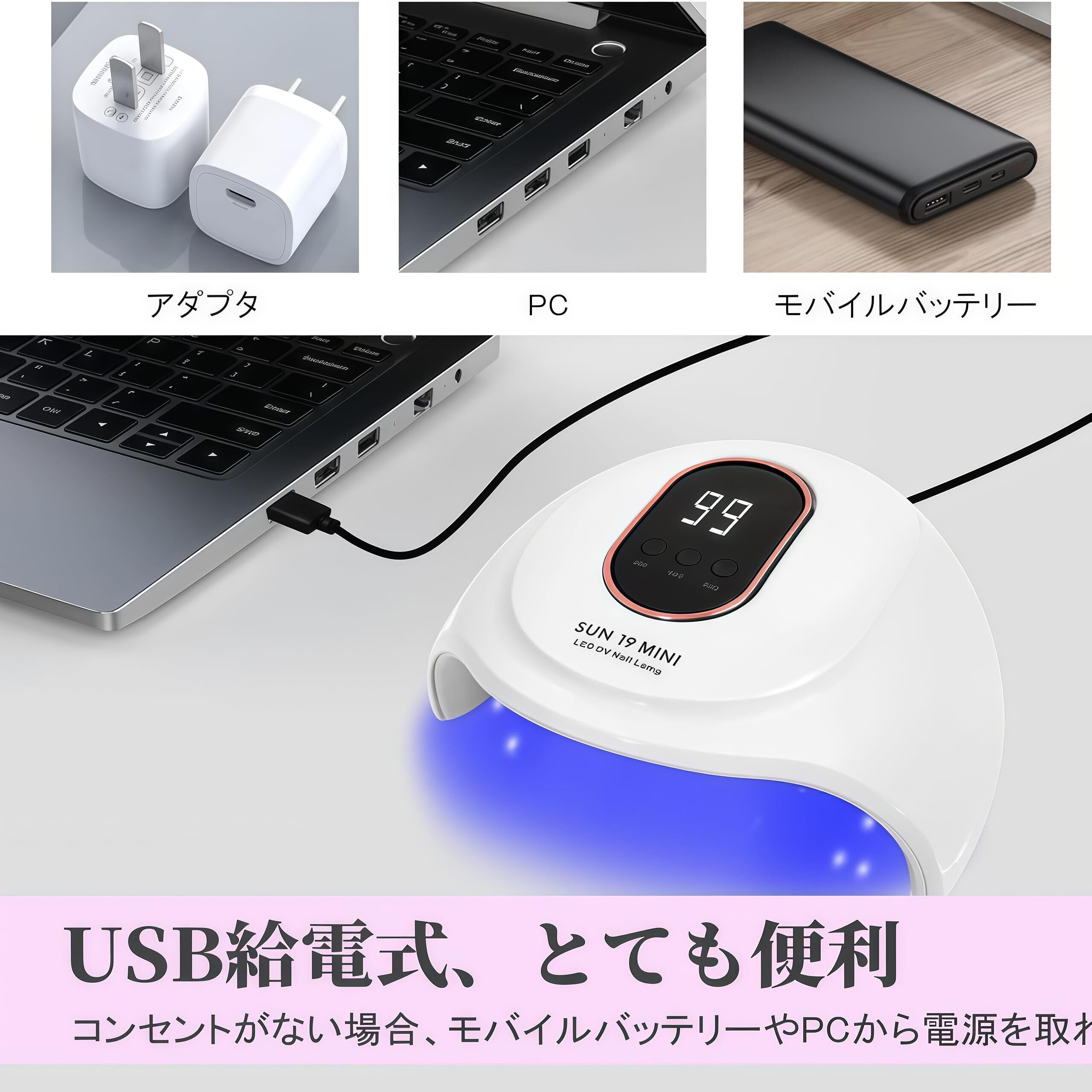 【USB給電&全ジェル対応】付属のUSBケーブルを使って、パソコンやモバイルバッテリーなどに接続して給電できます。UVライトのように消耗品を交換する必要がなく、ゴミが出ません。交換の心配がなく、環境に優しい省エネルギーネイルライトです。長い間のUVレジンやネイルを楽しむことができます。このled ジェルネイル ライトは、ベースジェル、トップジェル、カラージェル、ハードジェル、スカルプチュアジェル、ジュエルジェル、UVレジンなど、ほぼすべてのジェルタイプに適しています。