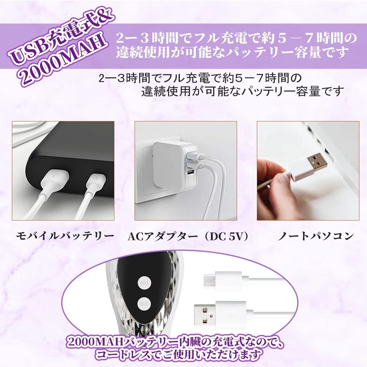 USB充電に対応しており、モバイルバッテリーやPCからも充電が可能。充電式のため、電源を気にせず使えます。いつでもどこでも美しいネイルを保つことができます。