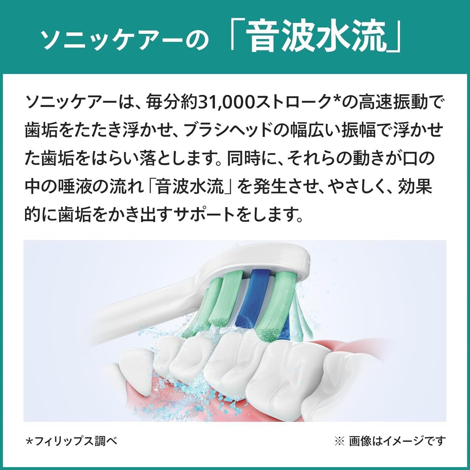【音波水流テクノロジー機能】毎分約31,000ストロークの高速振動で歯垢をたたき浮かし、払い落とし、かき出す