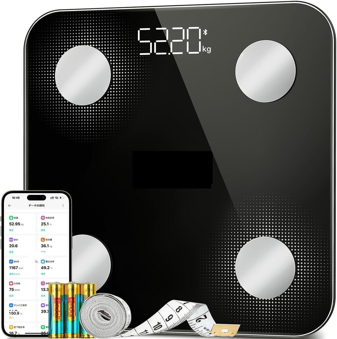 体重計 スマホ連動【2025新登場・BIA測定技術】 体脂肪計 高精度 体組成計 体重/BMI/体脂肪率/筋肉量/体水分率などの25種類項目測定 ボディスケール Fitbit連携 ヘルスメーター iOS/Android対応 家庭用 コンパクト 軽量 電池/巻き尺/取扱説明書付き ブラック