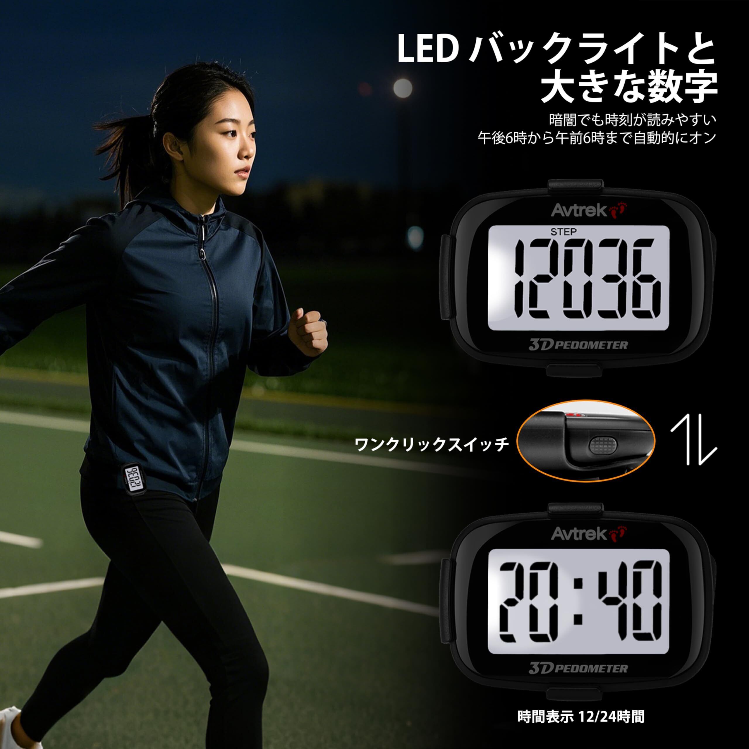 AVTREK 時間表示付きクリップ式歩数計、LEDバックライト、ウォーキングやランニングに最適、大画面、大型デジタルディスプレイ き