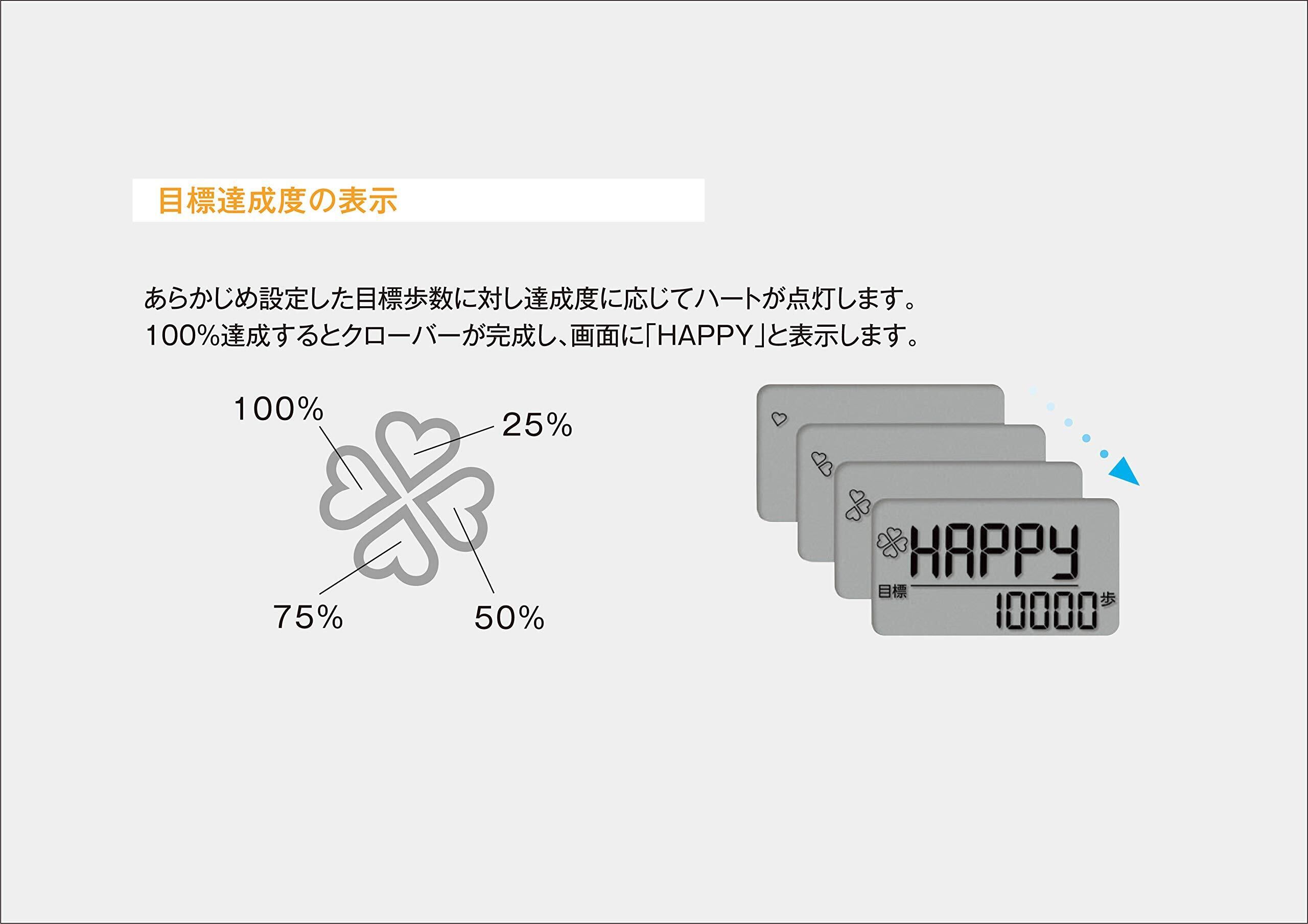 目標歩数の達成時には「HAPPY」が画面表示され、日本一周/世界一周の達成時には、それぞれ「JAPAN」/「EARTH」を画面表示。