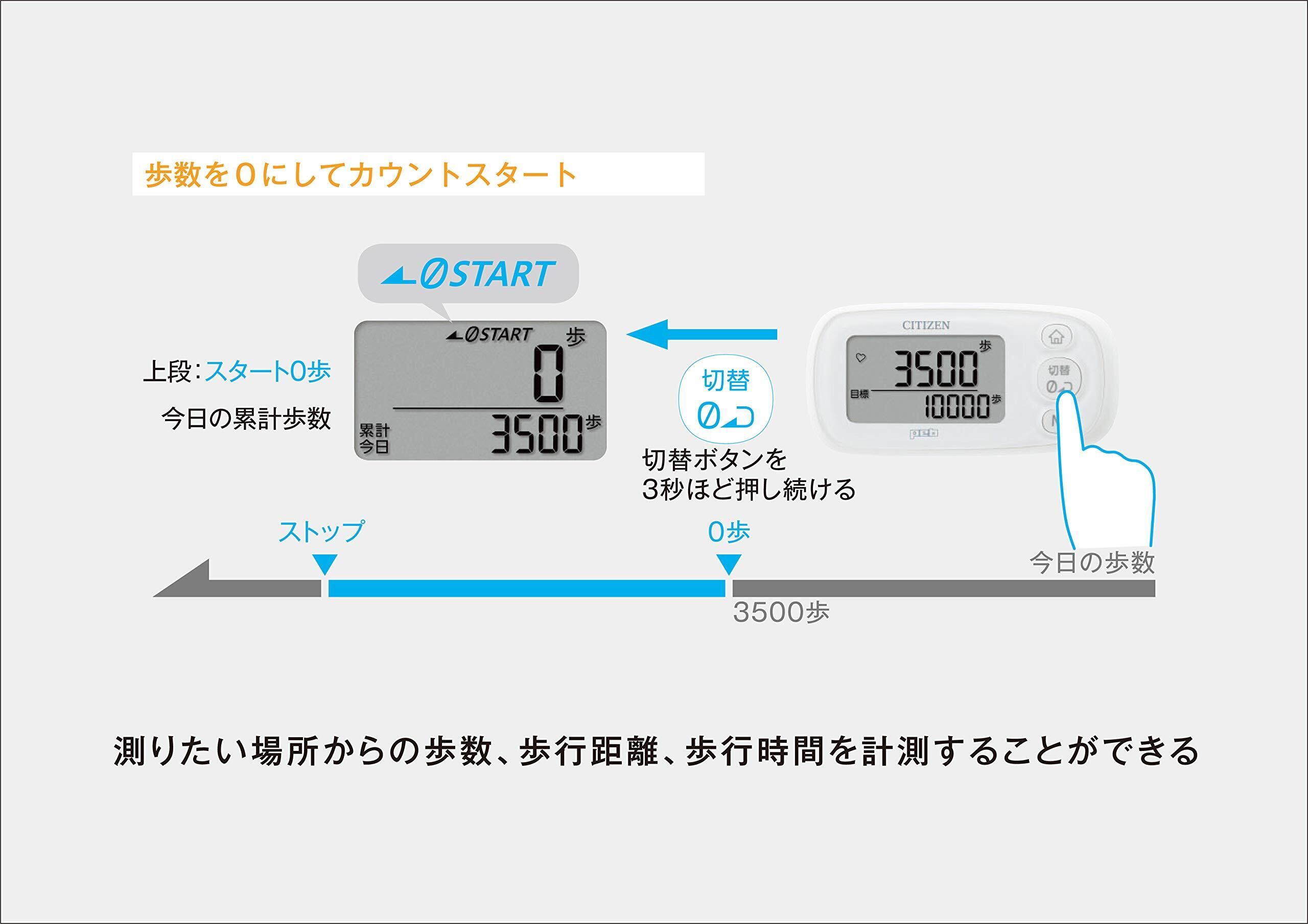 歩数、歩行距離、消費カロリーの計測に加え、ワンボタン操作で歩数が0歩の表示に切り替わり、測りたい場所からの歩数、歩行距離、歩行時間を計測することができる『スタートゼロ機能』を搭載。