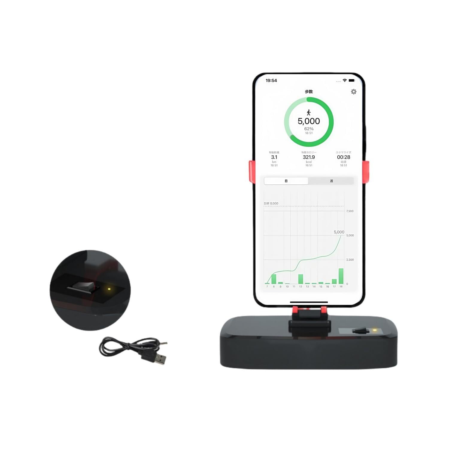 「マホスインガーラー」は、横揺れ運動でスマホを自動的に振り、歩数を稼ぐことができるUSB充電式タイプです。変速機能により、平均約1時間で10,000歩のステップを実現!運動不足を解消しながら、ゲームやチャレンジを楽しむのに最適です。