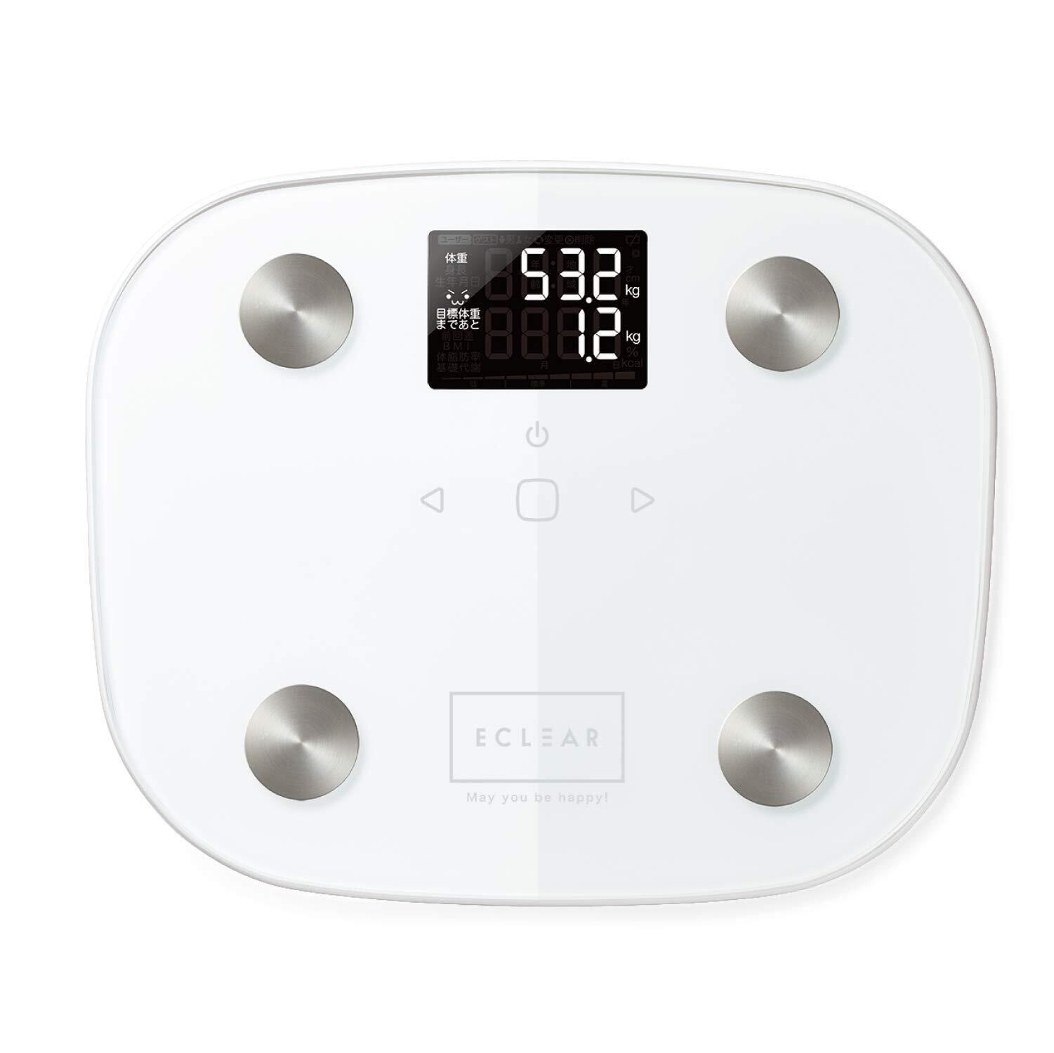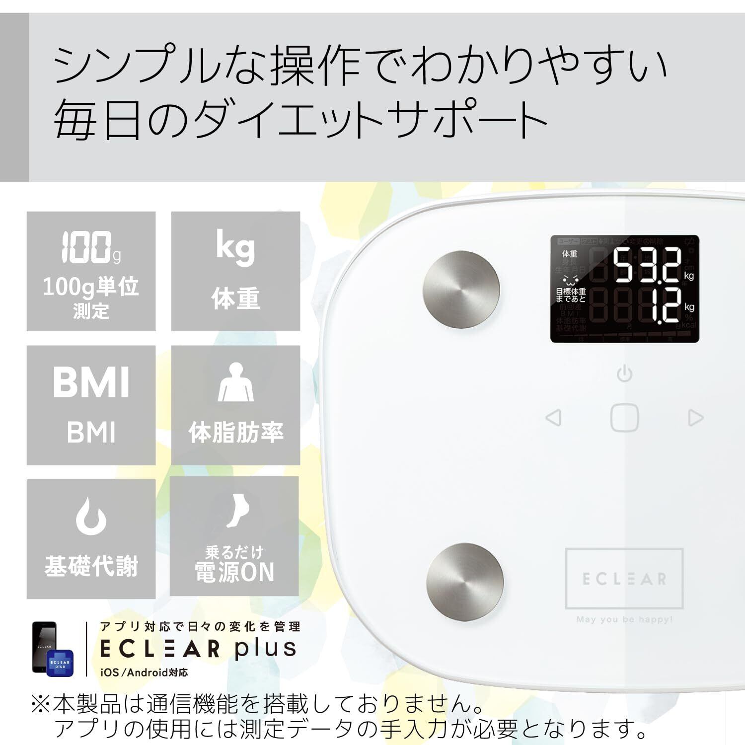 ●目標体重設定機能と顔文字表示で毎日の変化が見える"ECLEAR 体組成計"。●目標体重と現在の体重の差を表示する"目標体重設定機能"によって、目標との差が一目でわかり、モチベーション維持に最適です。●目標体重に対する成果がわかりやすい"顔文字表示機能"搭載。●目標体重に近づくとアイコンが笑顔になるなど、表情で一目でわかります。●体重・BMI・体脂肪率・基礎代謝の4項目が測定可能です。●筑波大学と共同研究した独自のMRI測定方式により、より正確な体脂肪率の測定が可能です。●乗るだけで過去の測定データから個人を推定する"自動認識機能"を搭載。●電源を入れるなどの手間がかからず、すばやく簡単に測定できます。●暗い場所でも表示が見やすい"バックライト"を搭載しています。●厚さ約18mmのコンパクト設計で収納にも場所を取りません。●専用アプリECLEAR plusに体重・体脂肪率を手入力すると、BMI、内臓脂肪レベル、骨量、骨格筋率、基礎代謝を確認できます。●体重、体脂肪率、骨格筋率はグラフで表示できるため、日々の変化を分かりやすく記録できます。