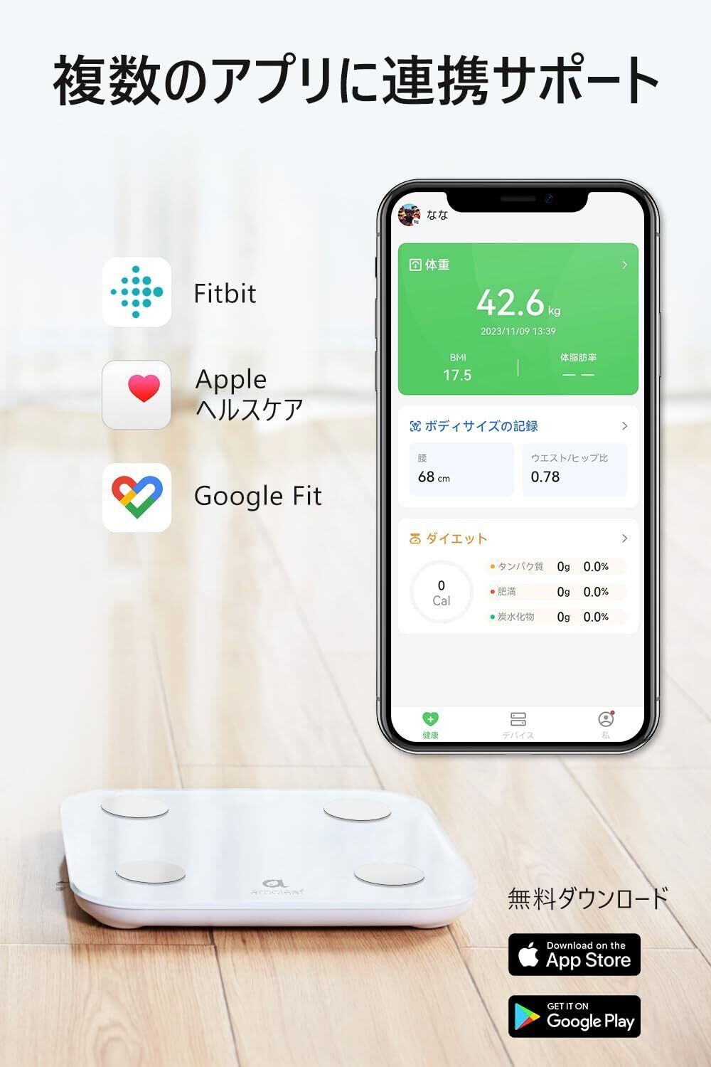 特徴 GoogleFit/Fitbit/appleヘルスケア連携, Wi-Fi/Bluetooth対応 スマホ連動, 毎回測定レポート, 消費カロリー, 飲食記録