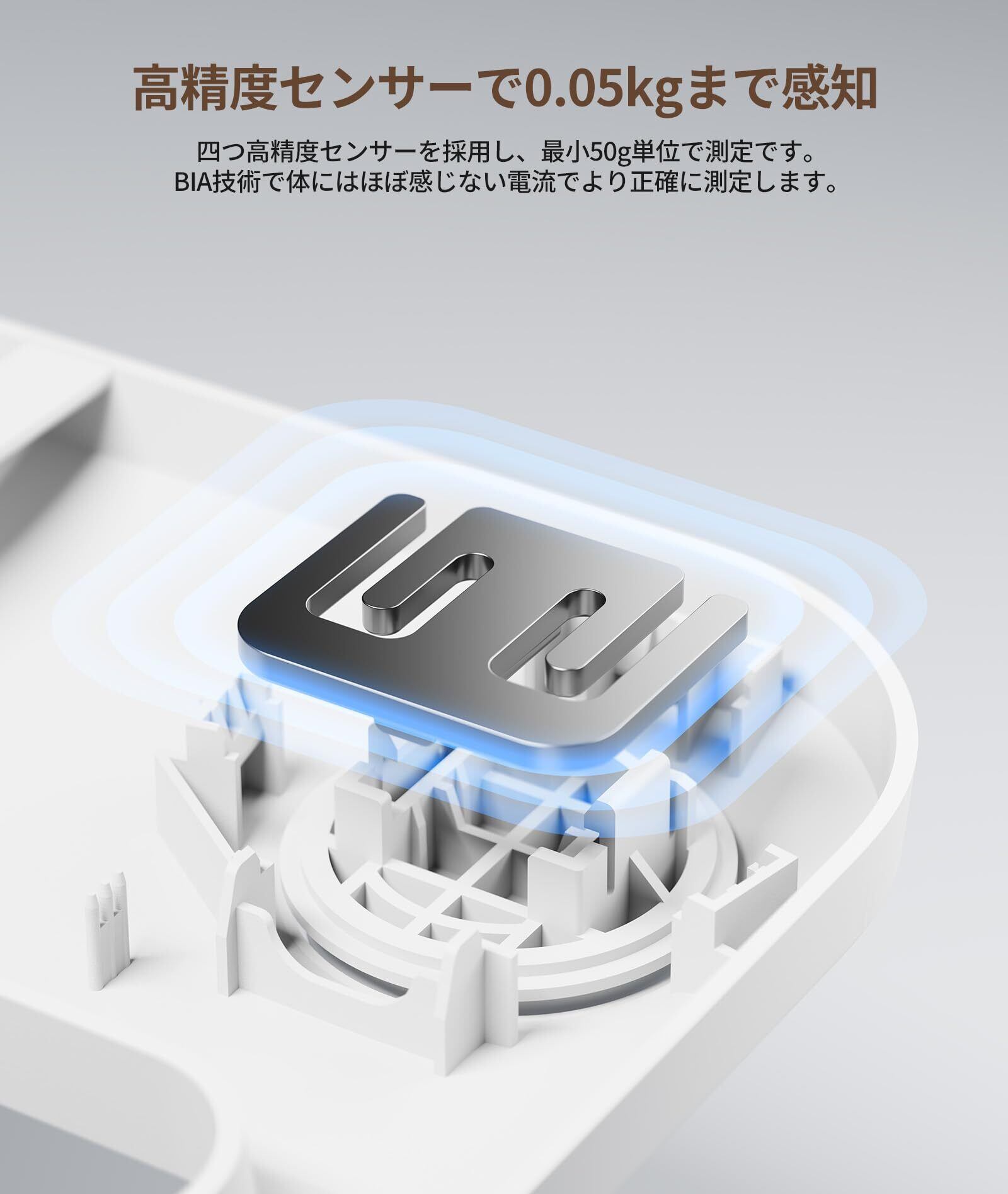 【BIA技術+高精度センサー搭載】生体電気インピーダンス分析法(BIA)を採用。4箇所に配置した高感度電極が体内の水分分布を解析。最小0.05kg単位までのプロ仕様精度を家庭で実現されます。