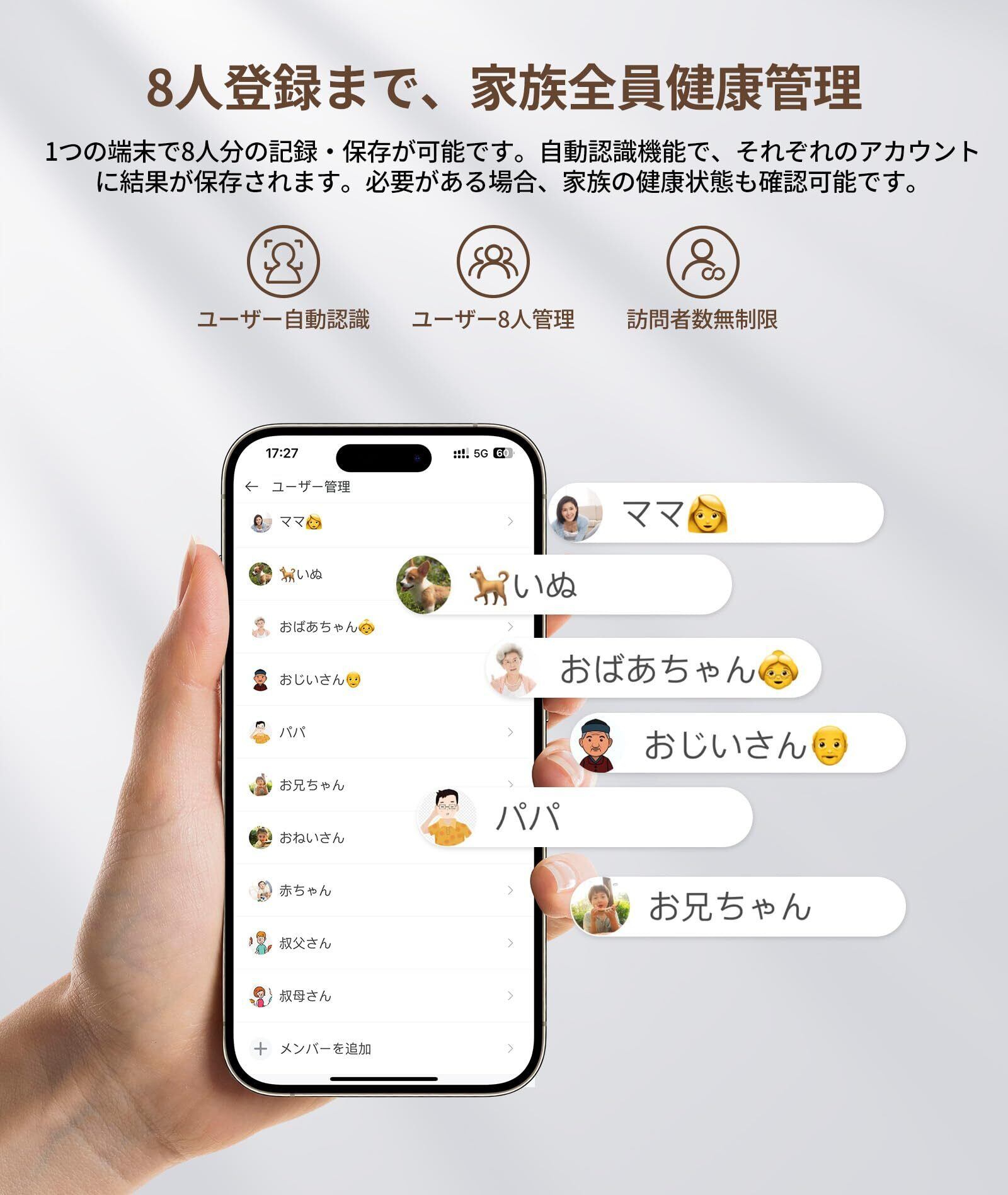 この体組成計は、登録人数に制限がないため、家族全員のデータを管理することができます。赤ちゃんやペットモードも搭載されており、皆さんの健康をサポートします。