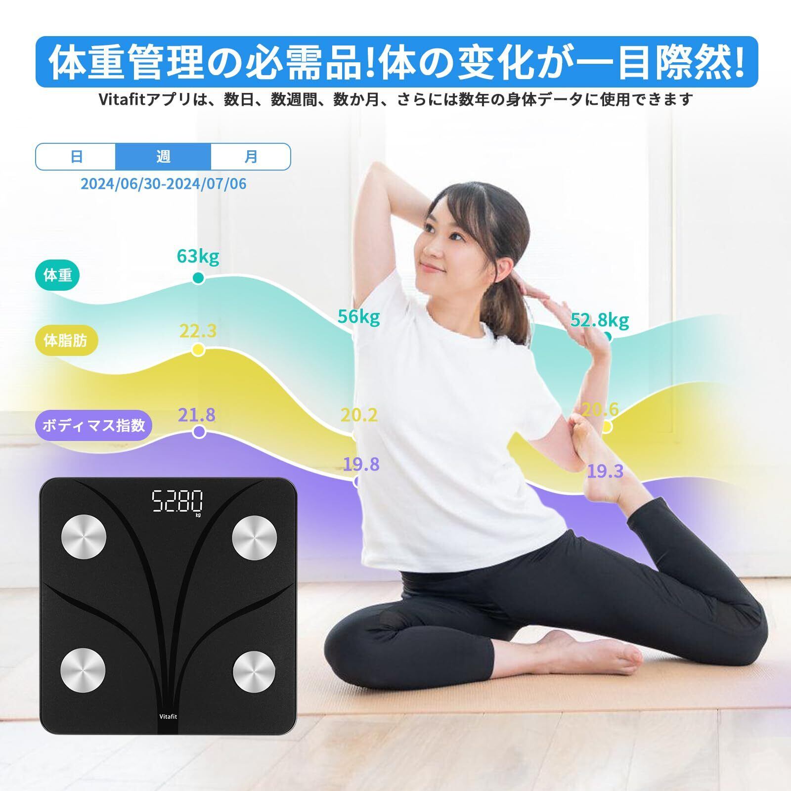 【体重計】Vitafit 体脂肪計・体組成計 、2001 年以来の計量専門工場、BMI、体脂肪、筋肉を含む 13 種類の体組成をアプリで同期、180kg x 0.05kg 精度(日本語対応APP&取扱説明書)、ブラック