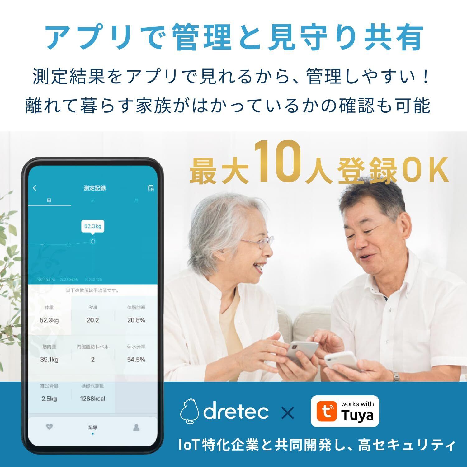 このdretec体組成計は、体重、体脂肪率、BMI、筋肉量から内臓脂肪、推定年齢まで、合計11項目を10秒で計測します。専用アプリと連携することで、手軽に健康状態を記録・分析し、ダイエットや健康管理に役立てることができます。