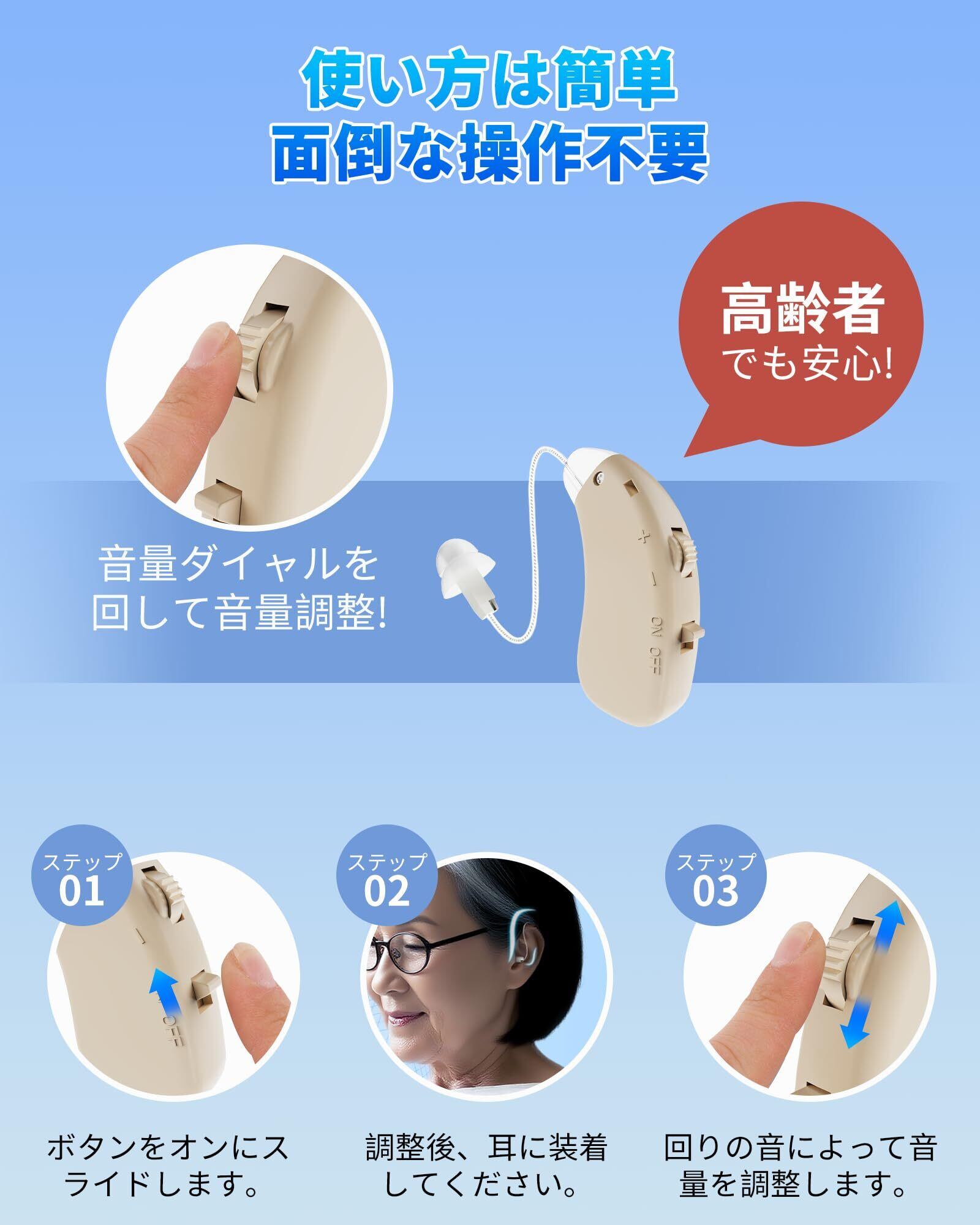シンプルなボタン操作で音量は無段階調整が可能。特に高齢者の方でも使いやすく、取扱説明書に沿って簡単に操作できます。また、耳にかけるだけで自動的に電源が入る便利な機能も搭載。使用後はそのまま充電ケースに戻すだけで自動的に充電が開始されます!