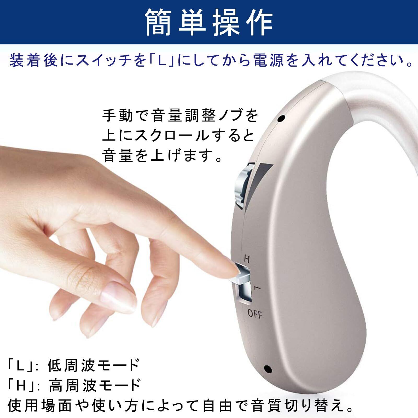 【音量調節・2つのモード】手動で音量調整ノブを上にスクロールすると音量を上げます。下にスクロールすると音量を下げます。モード切替ボタンで3つのモードが切り替えられます、使用シーンや周囲の状況に合わせて快適なモードを自由に選ぶことができます。(ハウリングやエコーを防止するため。装着後にスイッチを「L」にしてから電源を入れてください。)