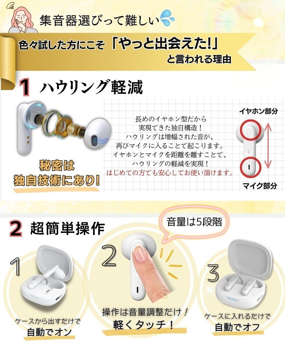 【MIMIKKO みみっこ イヤホン型集音器】 集音器 しゅうおんき イヤホンタイプ 高齢者 ワイヤレス 両耳用 充電式 【日本企業】 (白)