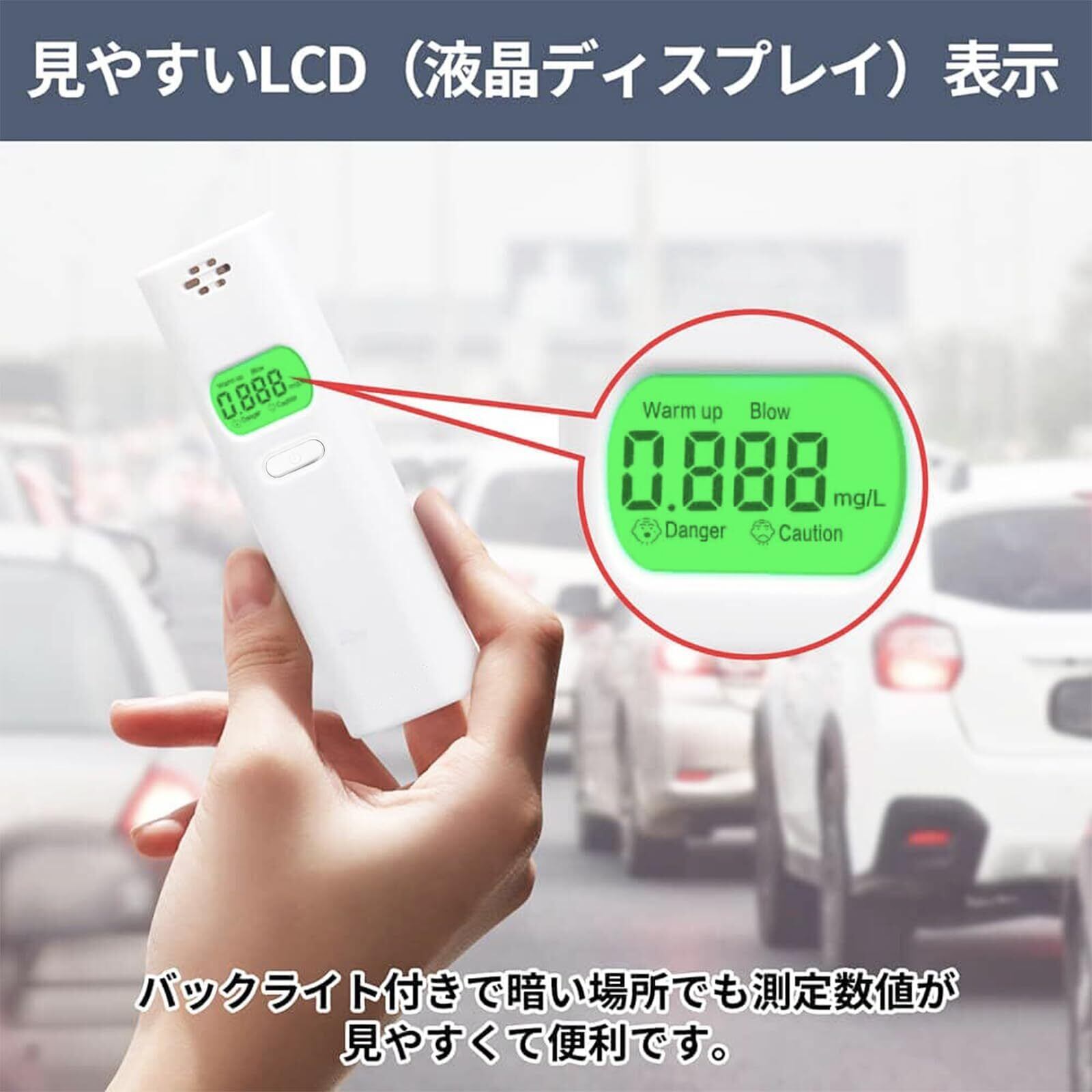 【スマートアラーム】警告音機能あり、測定結果によって、三つの状態が表示します。「未飲酒状態」LEDインジケータが緑点灯し、音声が出しません、運転できます。「飲酒状態」測定結果が「0.100~0.245mg/L」の時は、表示部に「Caution」と表示され警報音が鳴ります、運転できません。「酔った状態」測定結果が「0.250mg/L以上」の時は、表示部に「Danger」と表示され、Caution ダウより大きい警報音が鳴ります。(警告音を止めるには、電源ボタンを長押ししてい。電源をオフにしてください。)
