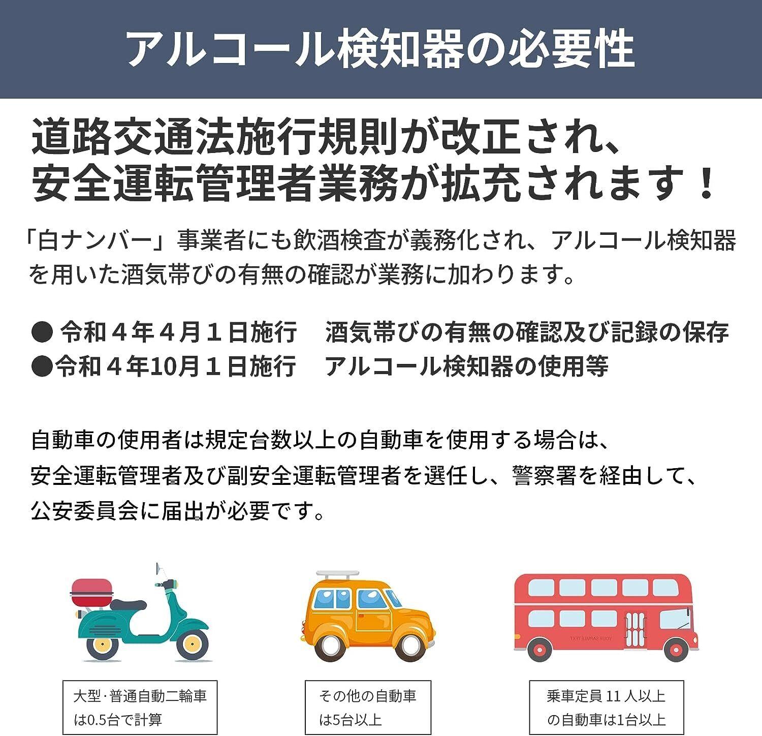 【超高性能・超高精度】アルコールチェッカーは高精度半導体ガスセンサー使用し、安全に運転できるかどうかを確認するために、5秒だけでアルコール濃度を検出できます。は高感度ICチップ内蔵で、測定準備時間は10秒で、測定時間は10秒です。測定完了後約20秒で自動OFFになります。【注意事項】国家公安委員会が定めるアルコール検知器としてご使用いただけます。 本機の使用の有無(判断結果を含む)に関わらず、飲酒運転に関しては一切責任を負いません。