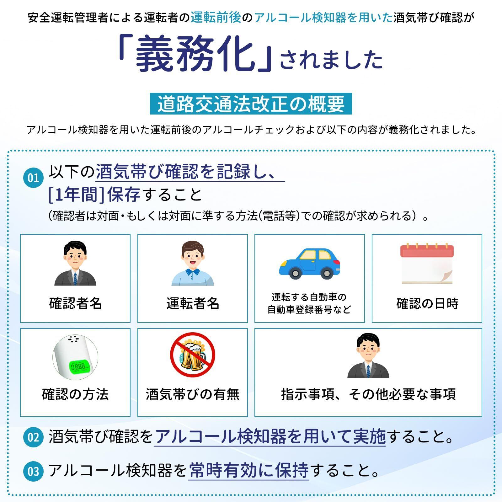 本製品は、家庭用・業務用問わず様々なシーンでご利用いただける高精度のアルコールチェッカーです。飲酒運転防止や健康管理の重要アイテムとしてぜひご活用ください。