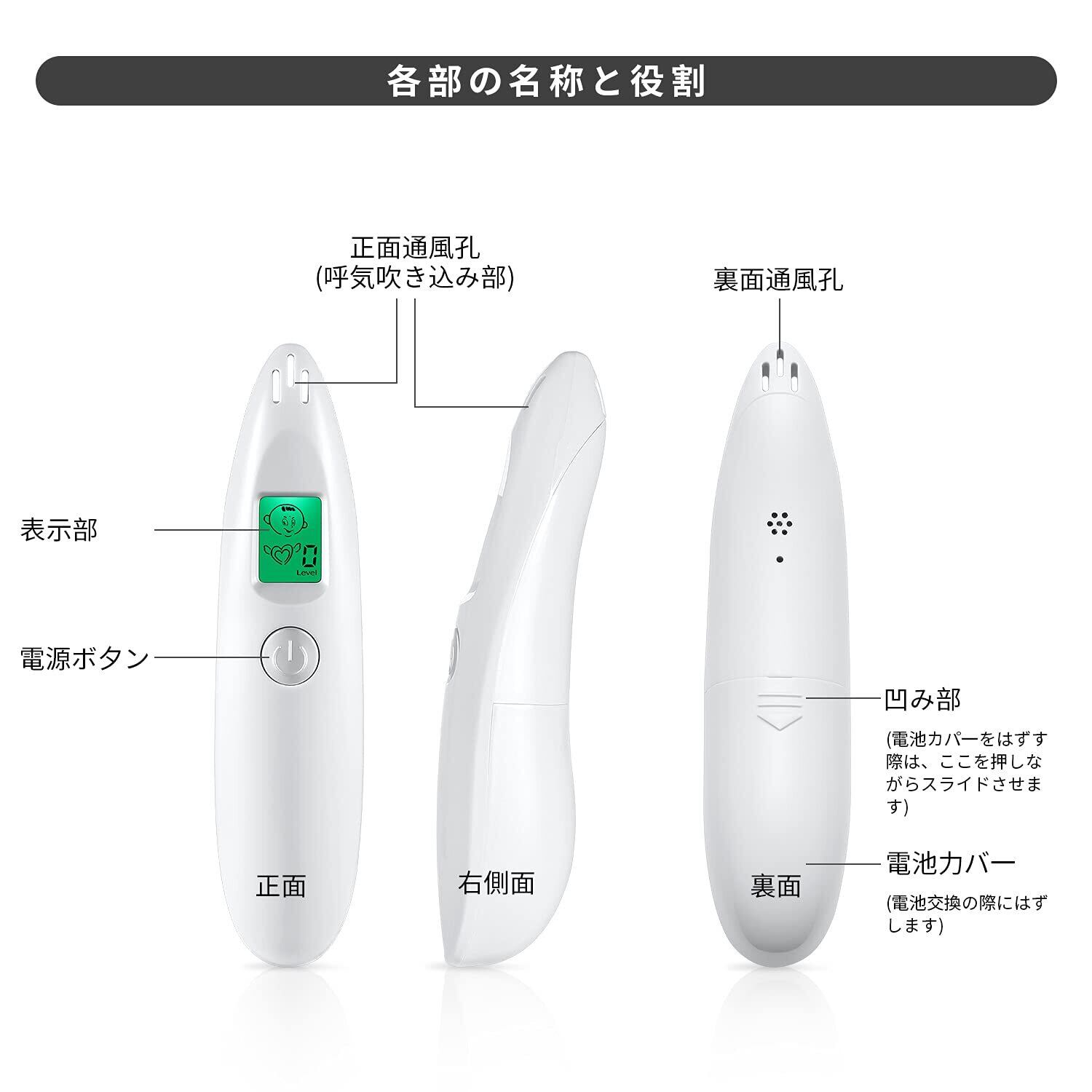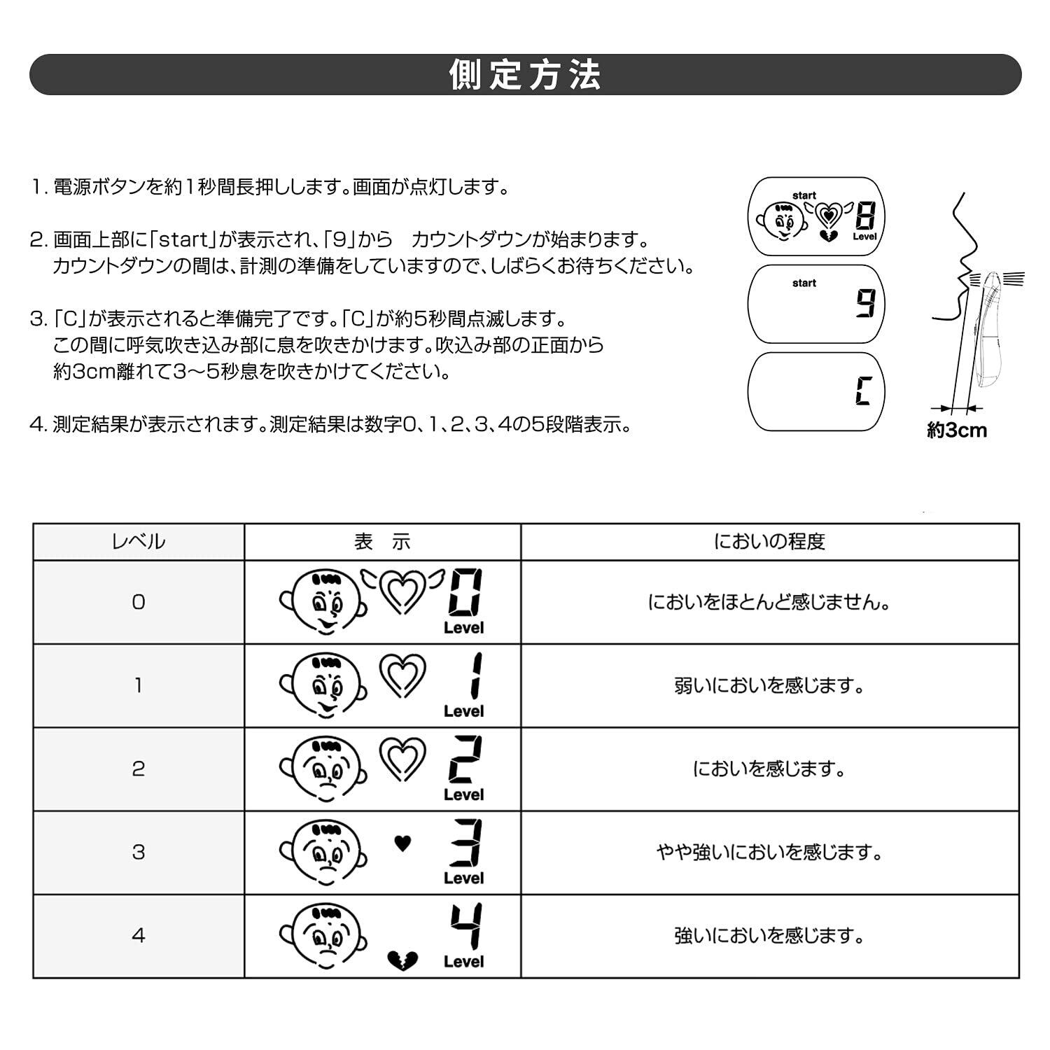 使いやすい:電源ボタンを1秒間押すだけで、口臭チェッカーが起動します、AAA乾電池2本(別売)を挿入して、口臭チェッカーをオンにし、10秒間(カウントダウン)待ってください、5秒間息を吹きかけたら、正確な結果が画面に表示されます。