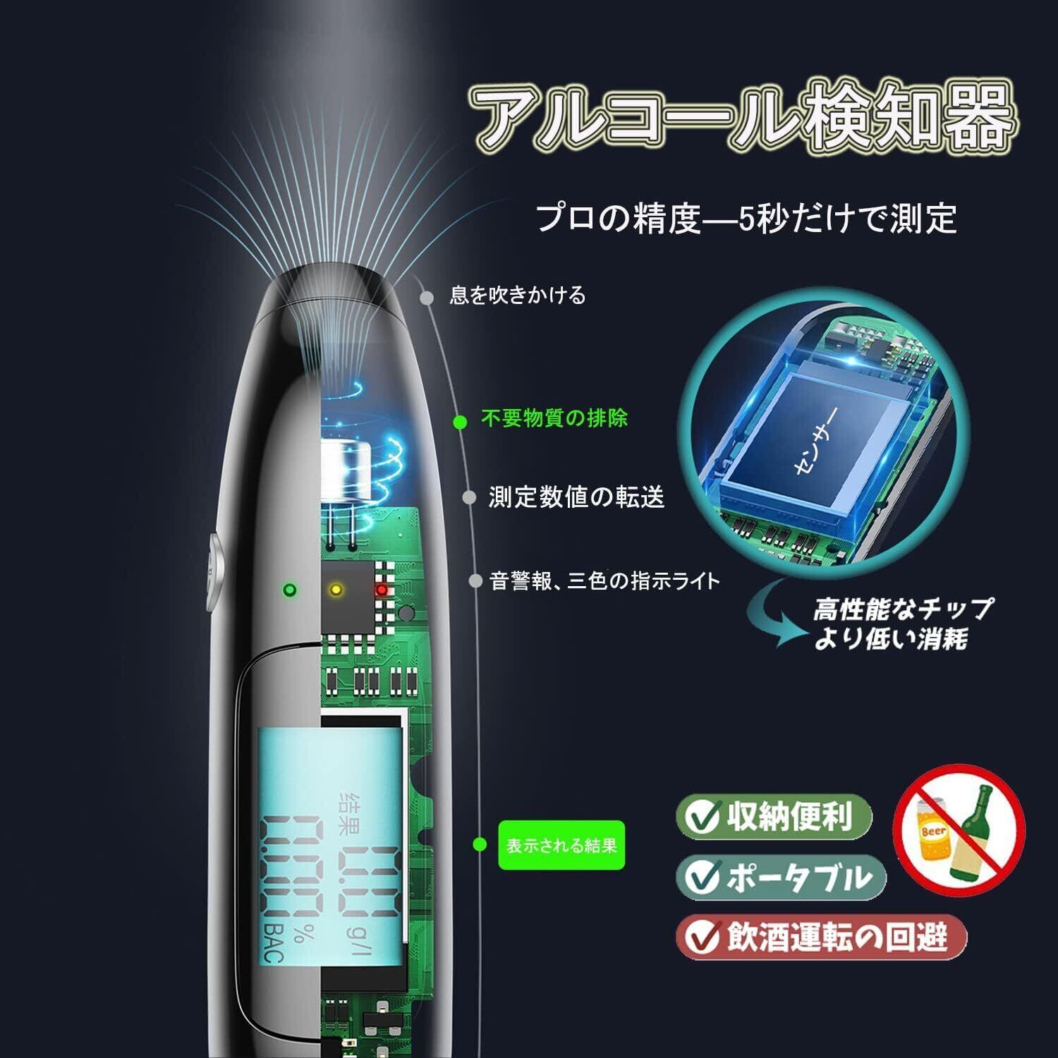 このアルコールチェッカーは非接触型の高精度アルコール検知器で、息を吹きかけるだけで迅速にアルコール濃度を測定します。業務用としても信頼性の高いパフォーマンスを提供し、安心して使用できます。