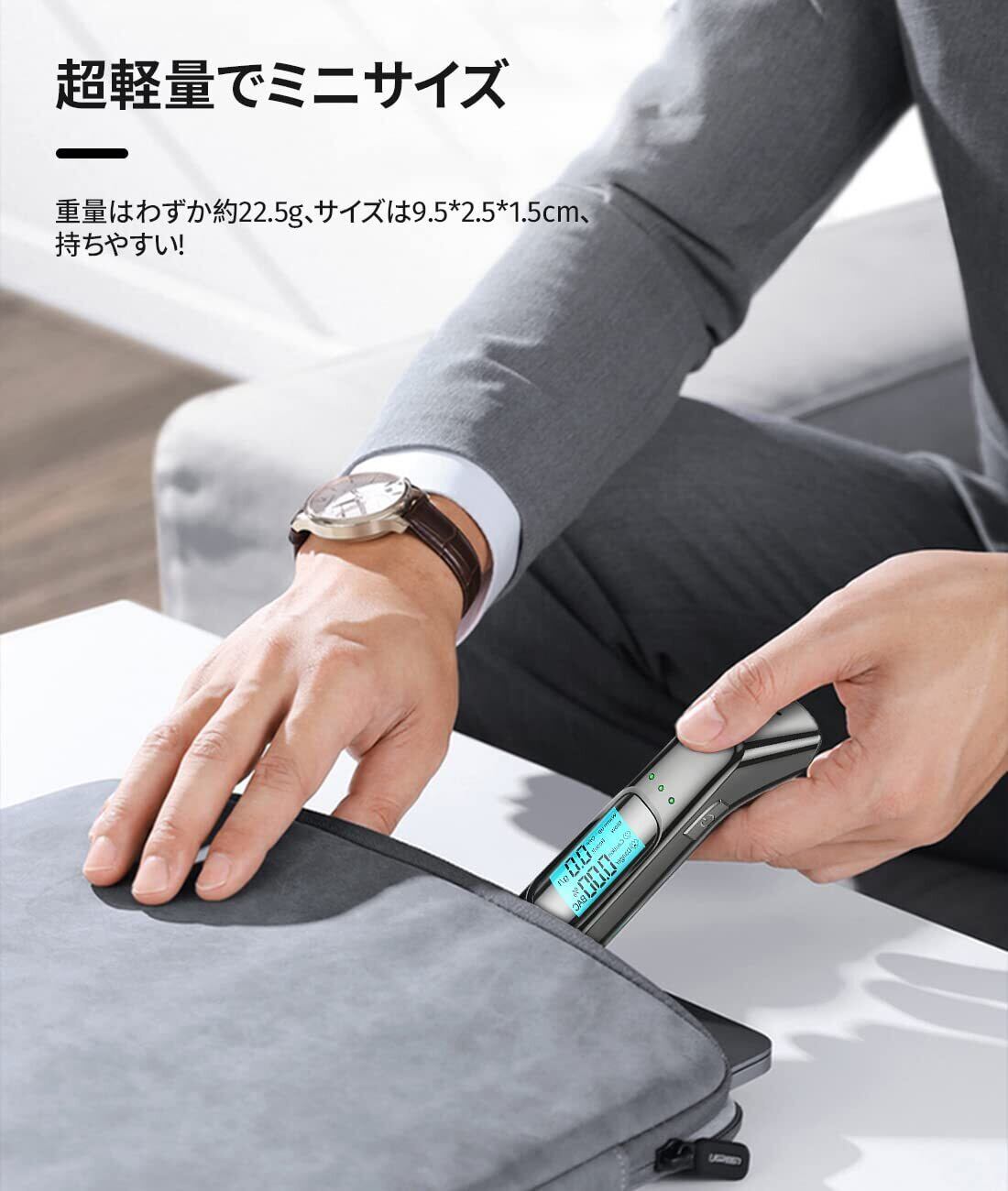 このアルコールチェッカーは、USB充電式の非接触型検知器としてデザインされており、息を吹きかけるだけで簡単にアルコール濃度を測定します。高精度のセンサーを搭載しているため、業務用としても信頼できる性能を発揮します。