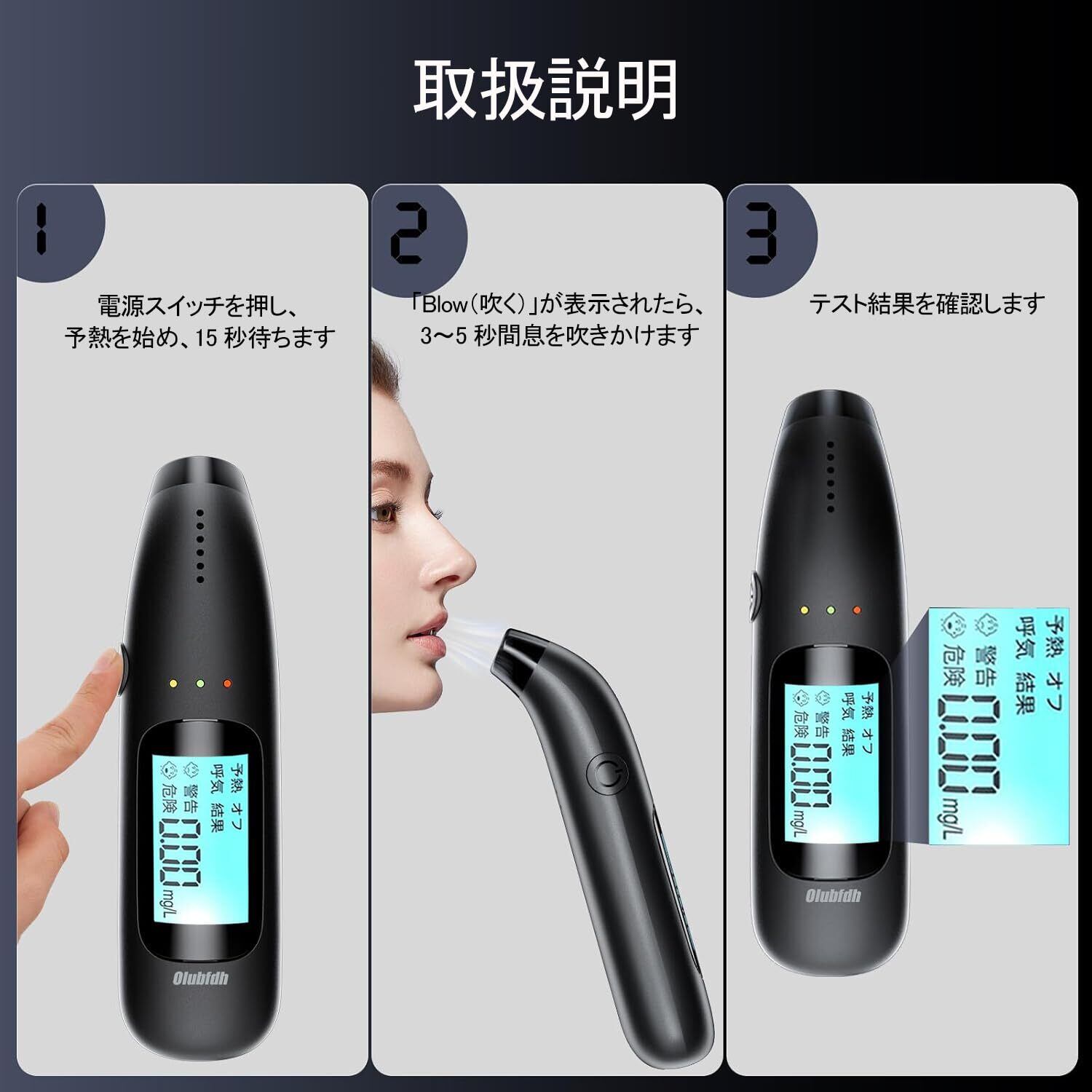 【使いやすい】このアルコールチェッカーは非常に使いやすく、吹き管は不要です。テスターの電源を入れ、15秒ほど温まるまで待ちます。その後、5~8秒間呼気を吹き込み、さらに2~3秒後に液晶ディスプレイに結果が素早くはっきりと表示されます。ご注意:飲酒後、20分ほど待ってからアルコールチェックをご使用ください。精度を保つため、3回連続でテストを行い、平均値を出してください。
