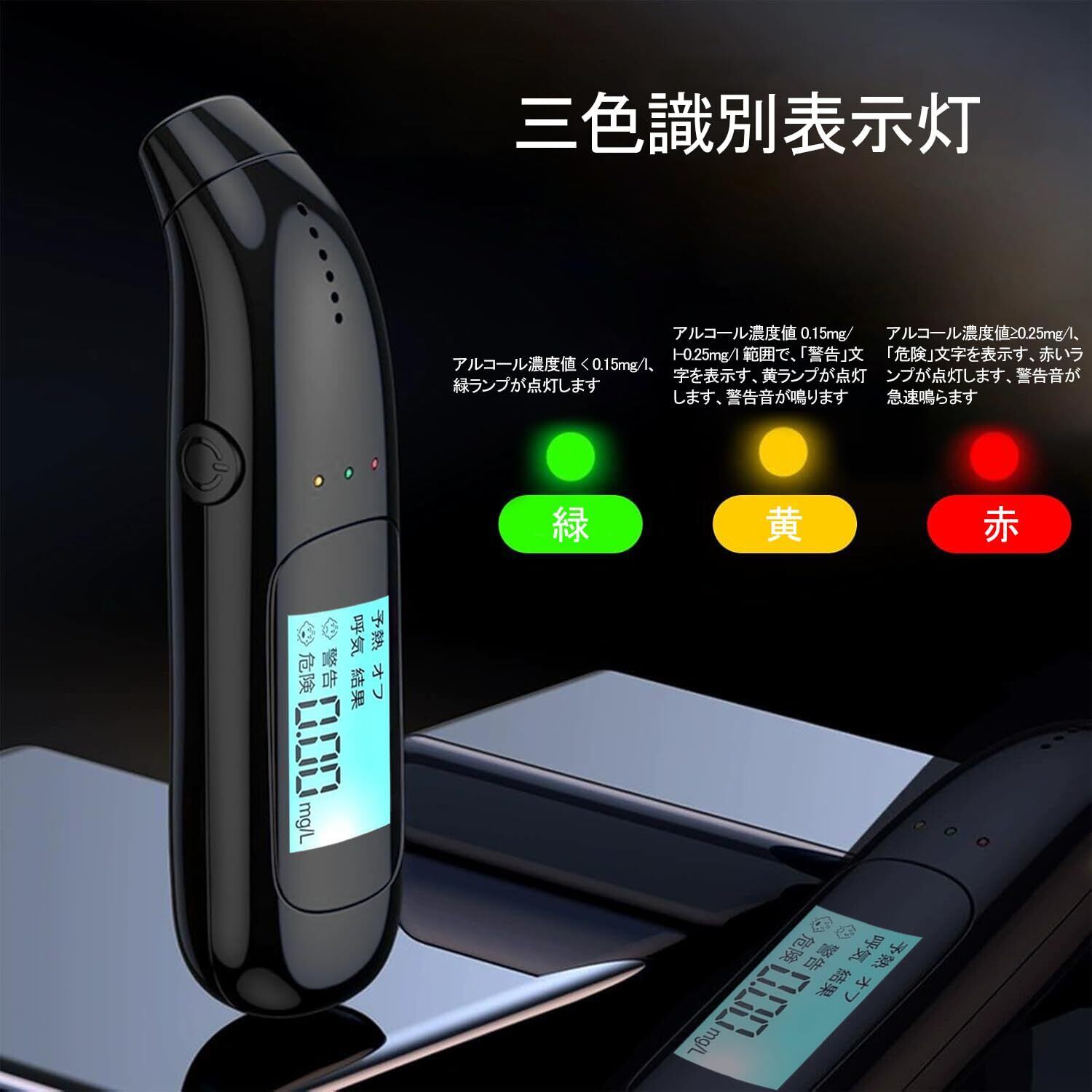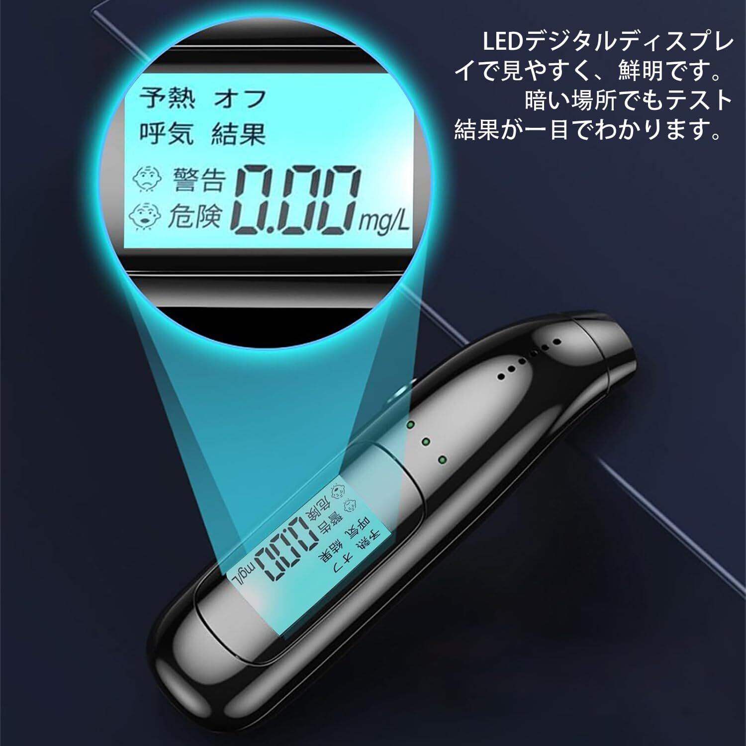 このアルコールチェッカーは、呼気中のアルコール濃度を迅速かつ正確に測定する非接触式のデザインです。飲酒運転防止のために、個人用から業務用まで幅広く対応します。大切な会議や自動車運転前の自分の状態をしっかり確認できます!