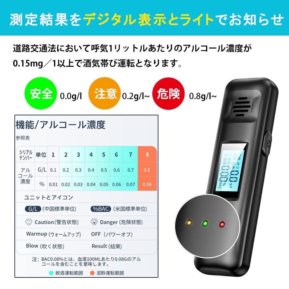 【大液晶ディスプレイ&警告音】アルコール検知器はライトがついているので、暗い場所でも見えやすいです。測定データが数字が大きく、コントラストがはっきりしています。また、測定状況に応じて警告音も鳴ります。警告音は測定結果によって、①「未飲酒状態」:アルコール濃度値は0.00%BAC(または0.0 g/L)、緑ランプが点灯します;②「飲酒状態」:アルコール濃度値≥0.01%BAC(または0.1 g/L)、0.08%BAC(または0.8 g/L)未満、黄ランプが点灯します、警告音が鳴らます;③「酔った状態」:アルコール濃度値は0.08%BAC(または0.8 g/L)以上、赤いランプが点灯します、警告音が急速鳴らます。