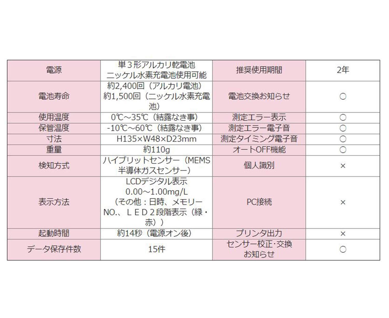 ●本器の使用の有無に関わらず、飲酒運転や法的に認められない行為に関して、製造および販売に携わる関係者は一切の責任を負いません。●アルコール成分以外の一酸化炭素、揮発成分、化学物質等に反応する事があります。洗口剤の使用、喫煙、薬の服用等を口にした場合は水でうがいをした後、最低20分以上経過してから測定して下さい。●定期点検 2年、または測定約5,000回で、センサーの点検・校正が必要となります。※お買い替えを推奨致します。※メンテナンスについてはコールセンターまでお問合せ下さい。 ※商品のデザイン、仕様、価格等は予告なく変更となる場合がございます。