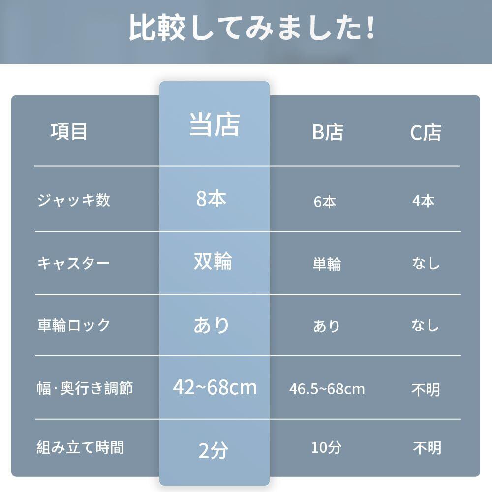 幅と奥行きは42cmから68cmまで調節可能で、個々の家電に最適なサイズにピッタリ合わせることができます。さらに、高さも調整できるため、作業効率を向上させることが可能です。