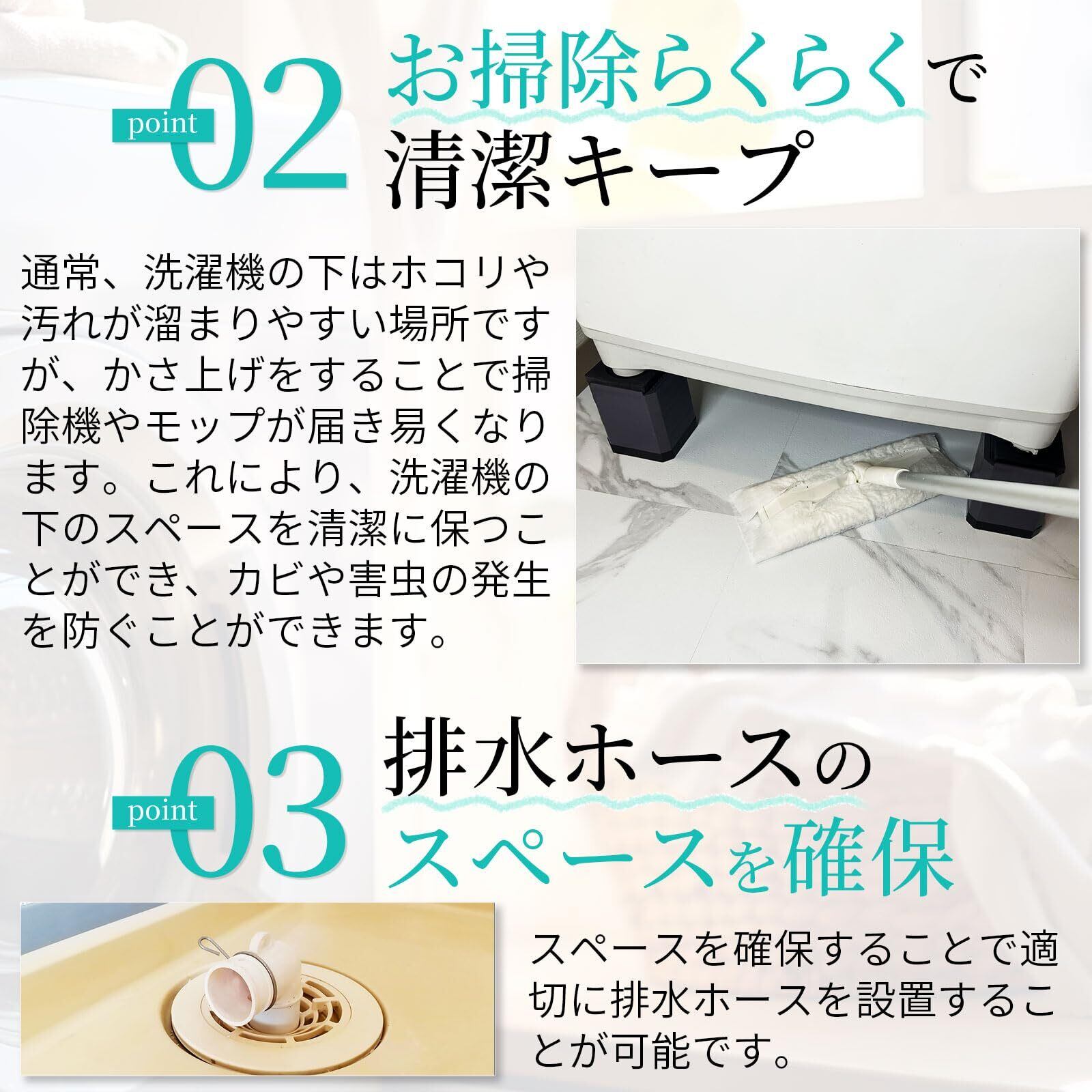 【お掃除が簡単】かさ上げすることで洗濯機下にスペースが生まれ、掃除がしやすくなります。また、洗濯機の出し入れ時に屈む必要がなく、腰への負担も軽減します。