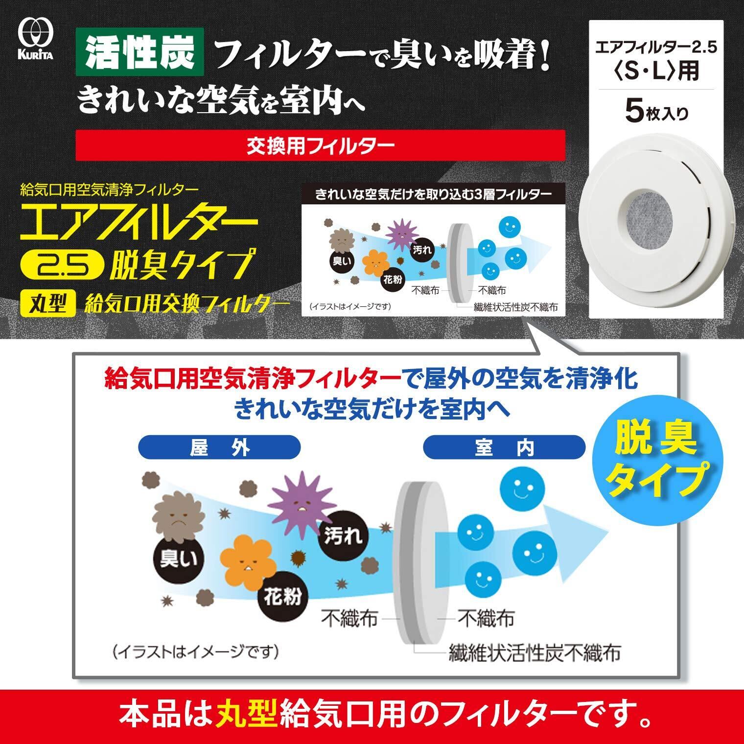 クリタックのエアフィルター2.5は、丸型給気口用に設計されており、優れた脱臭機能を備えています。5枚入りのセットで、これを使用することで、部屋の空気が常に新鮮に保たれ、快適な環境を実現します。