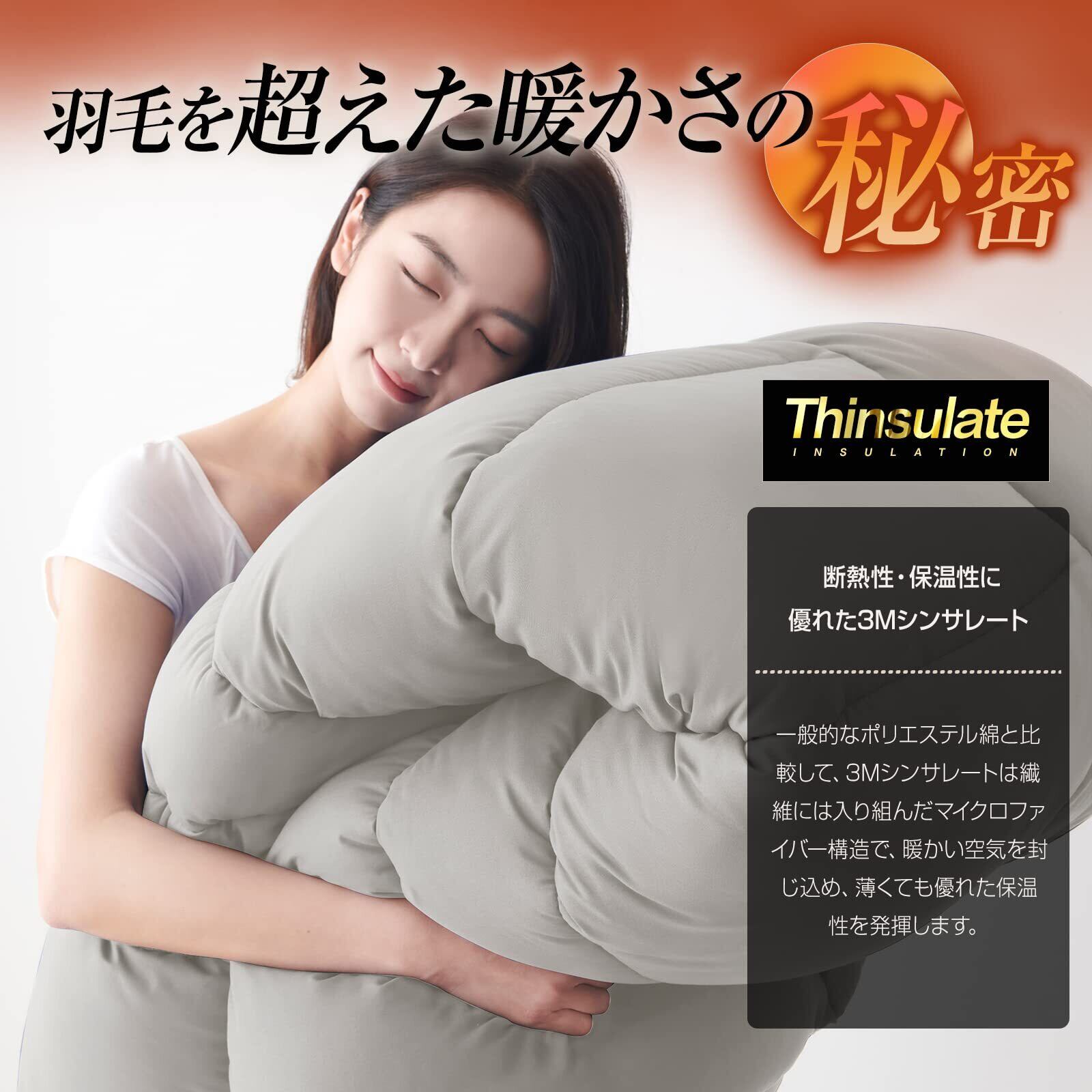シンサレート掛け布団は、優れた保温性を持つ特別な素材を使用し、寒い冬でも心地よい暖かさを提供します。羽毛布団よりも暖かく、寒い季節を快適にお過ごしいただけます。軽量でありながら、しっかりと身体を包み込み、安心感のある眠りへと導きます。