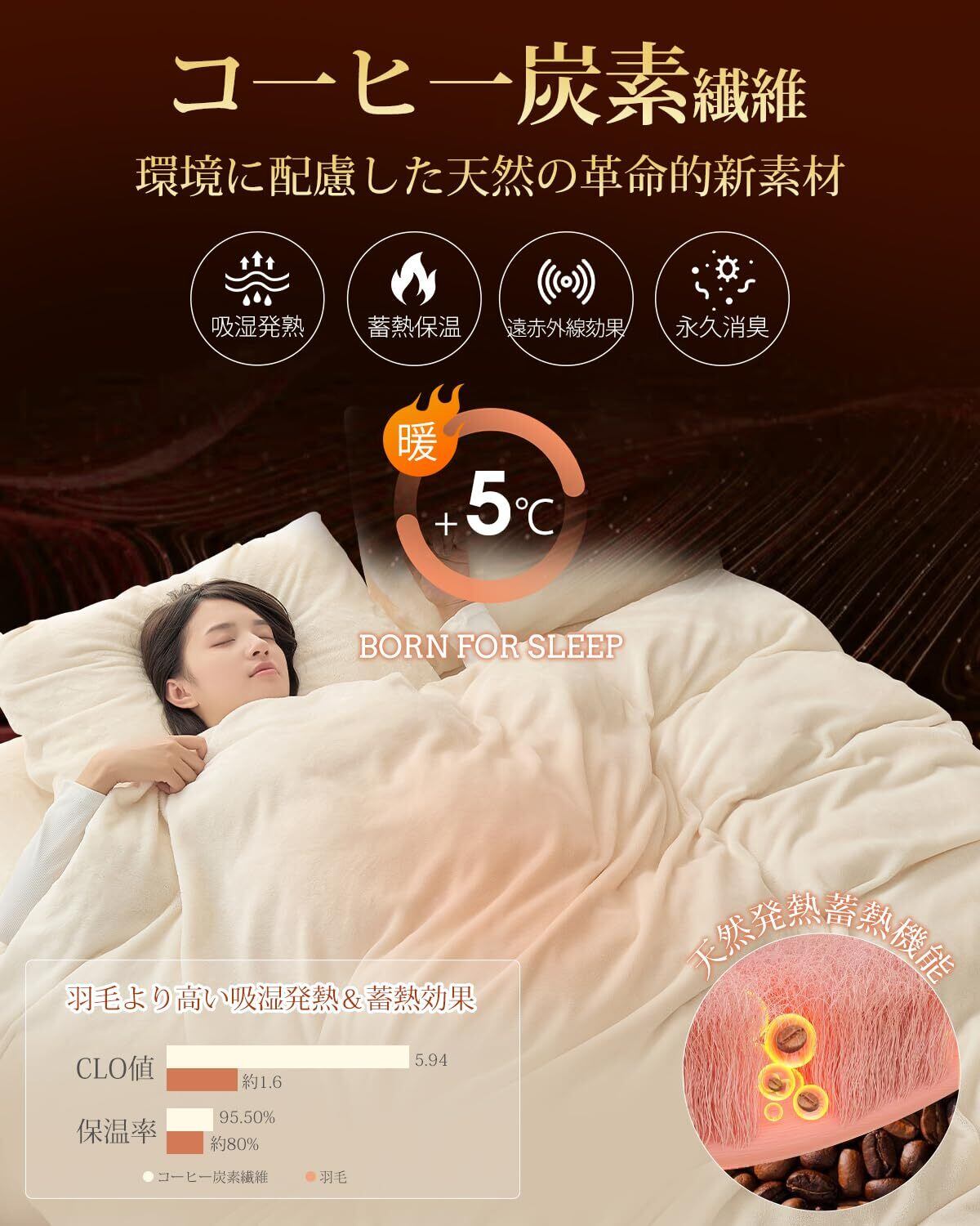 【プラス5℃蓄熱保温】天然発熱素材のコ一ヒ一炭素纎維をフランネル地に練り込み、格段に暖かさを保ってくれます。細かい繊維の隙間にたっぷり空気を含むので、身体の熱を保持します。体から放出される遠赤外線を素早く吸収して再放出するため暖かさが体を包み込みます。布団に入った瞬間、ふわふわぽかぽかな暖かさに包まれます