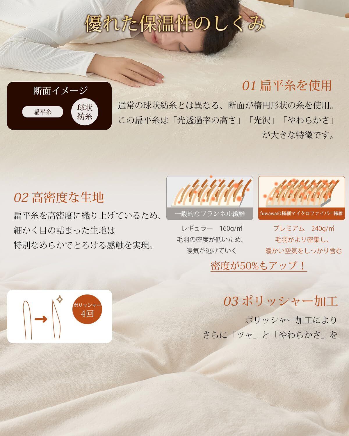 【とろけるような肌触り】肌触りを決めるのは、毛足の長さと細かさです。fuwawa布団カバーは表裏とも220g/㎡高密度極細フランネル素材を採用、きめ細かい繊維はみっちり詰まっているからふわふわ柔らか、一度触るとやみつきです。