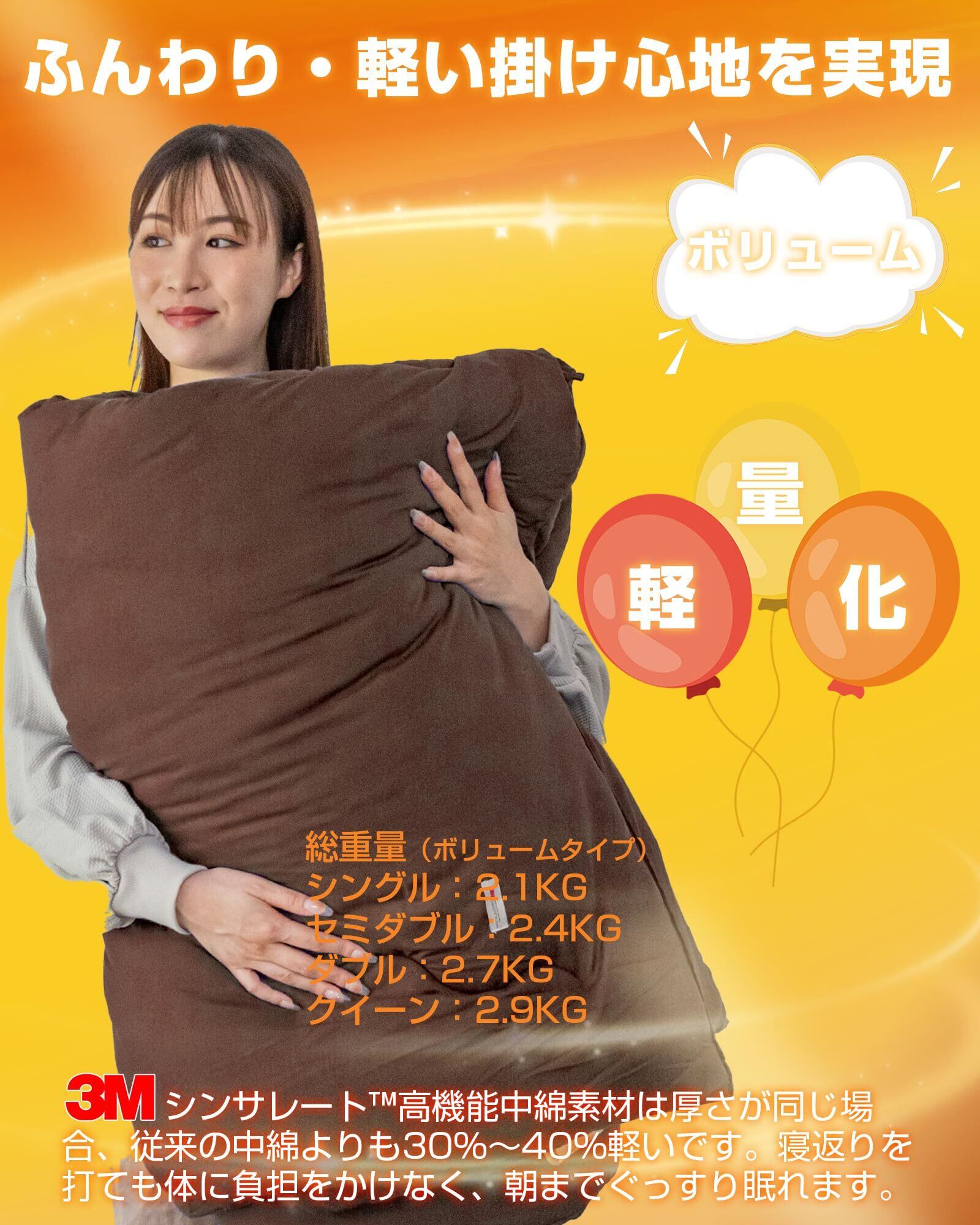 【仕様】タイプ:ボリュームタイプ 寸法:約150×210cm。総重量(カバー含み):2.1kg(詰め物:1.5kg) 万一品質に不具合が生じた際は、ご購入から1年間は対応させていただきます。商品企画:日本 生産国:中国。