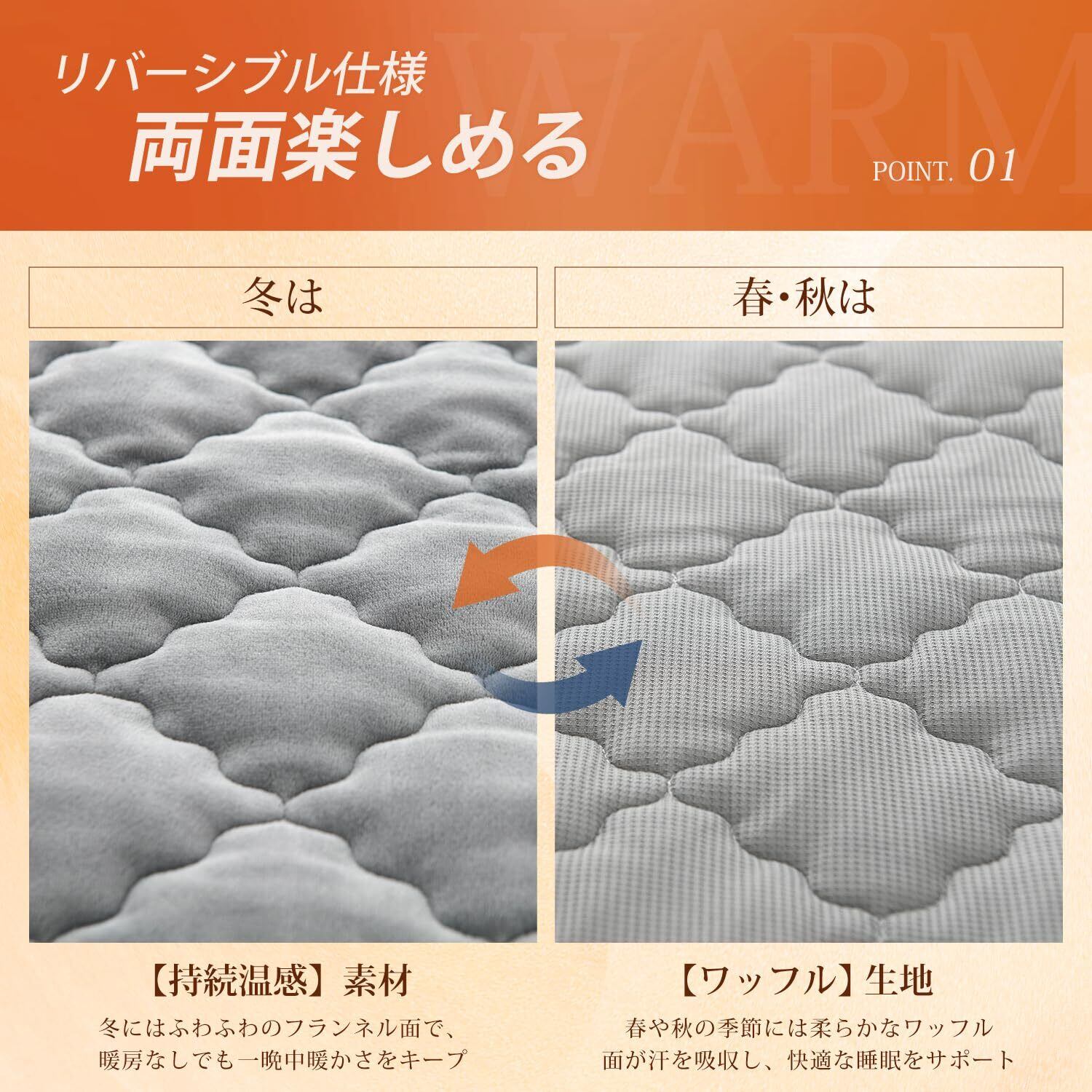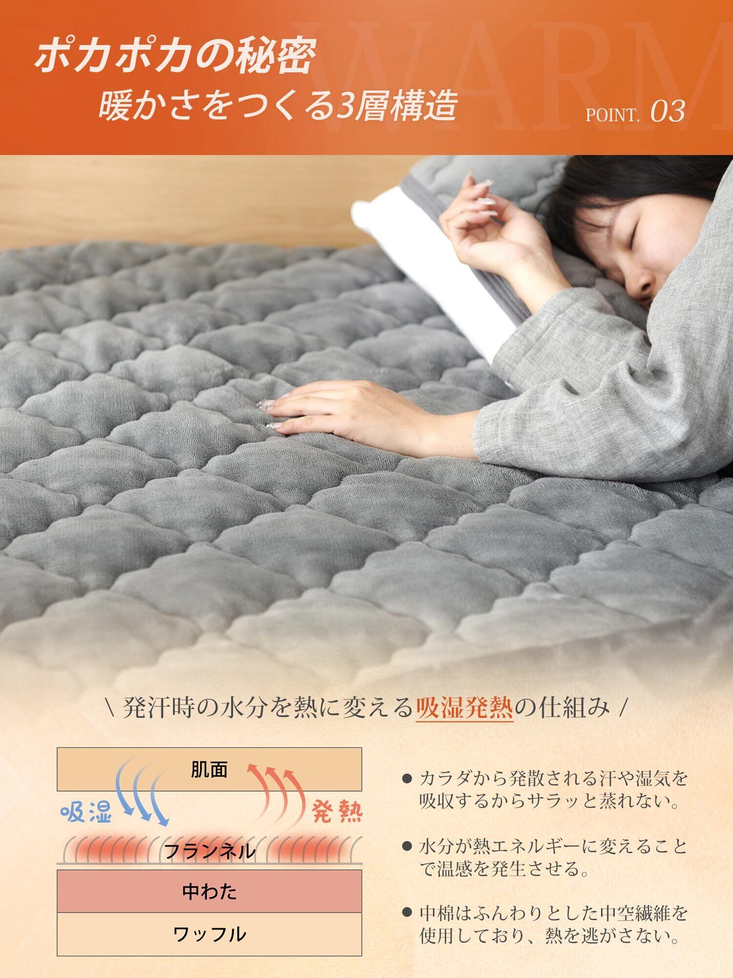 「持続温感敷きパッド」フランネル面は柔らかく、厳冬でも布団に入る瞬間にヒヤッとしません。マイクロファイバーを使用しているため、細かい繊維の間に空気を取り込み、暖かい空気を逃がさずに保ちます。さらに、蓄熱中ワタは体から発生する湿気を熱に変え、持続的な暖かさを実現します。