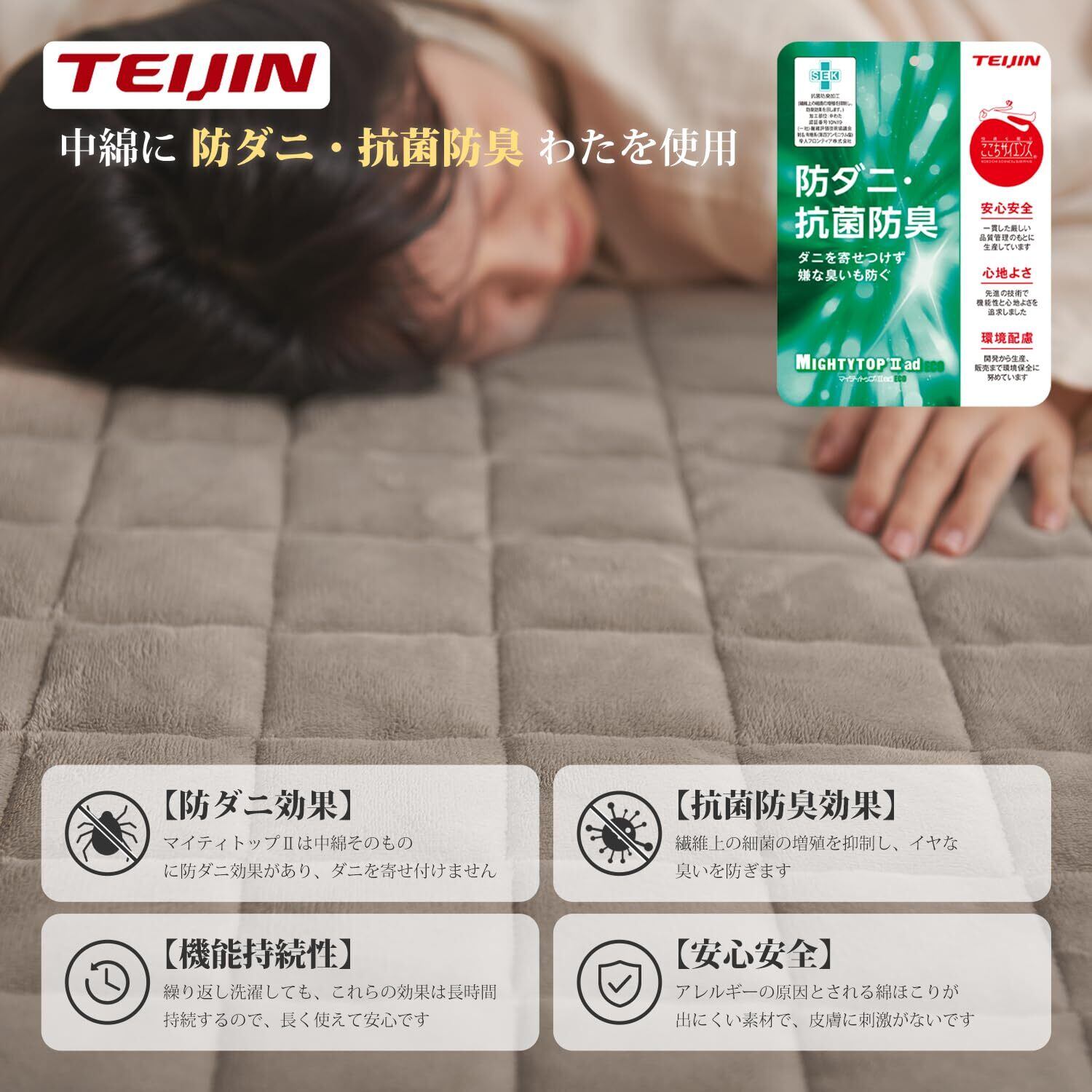 <帝人TEIJIN中綿>:中綿に防ダニ・抗菌防臭のTEIJIN綿を使用しているので、細菌の増殖を抑制し、イヤな臭いを防いで、アレルギーの体質の方にも適しています。