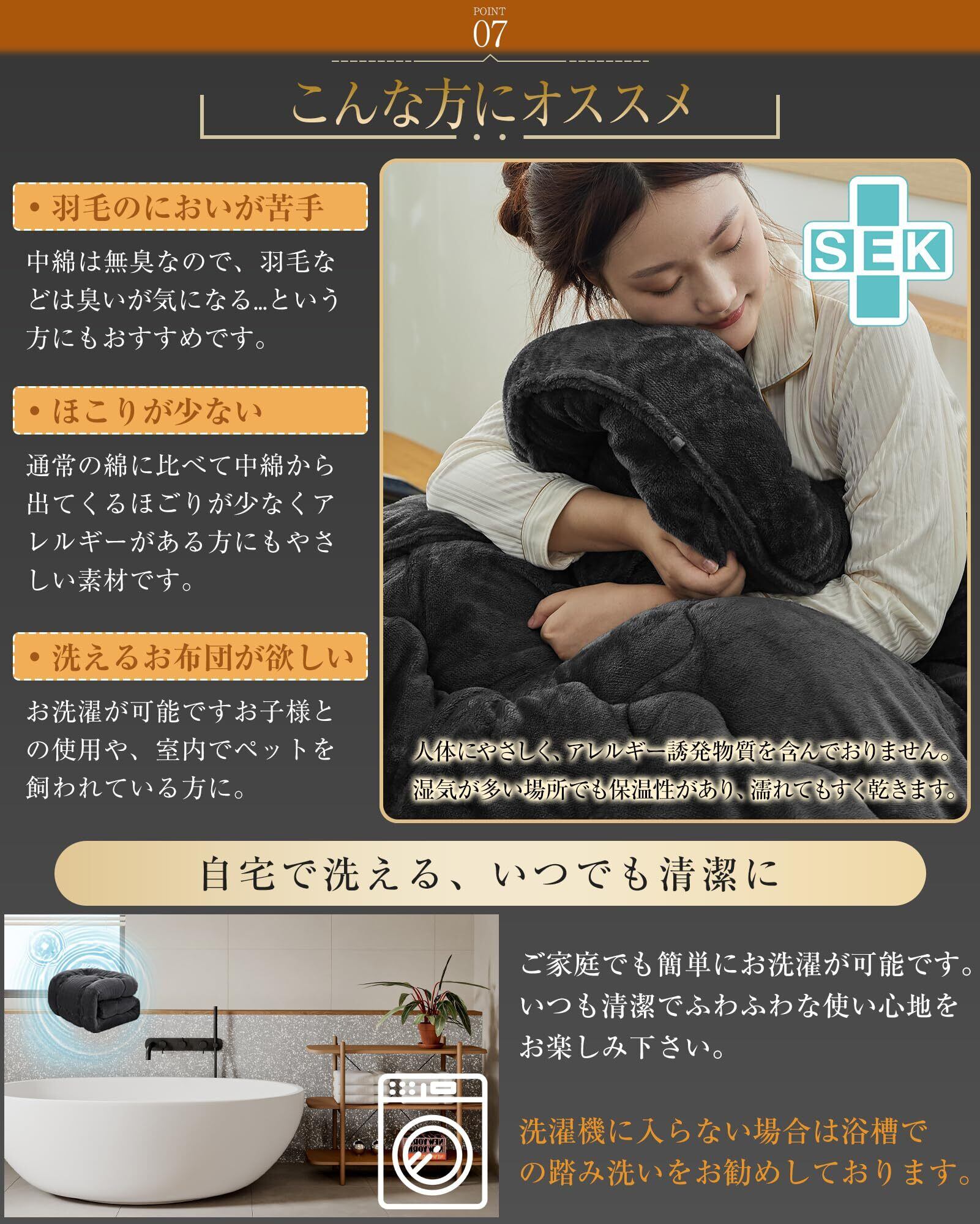 こちらの掛け布団は自宅で簡単に洗濯可能です。家事の合間に手軽にお手入れでき、いつでも清潔な状態でご使用いただけます。抗菌防臭防ダニ加工が施されているため、衛生面でも安心です。