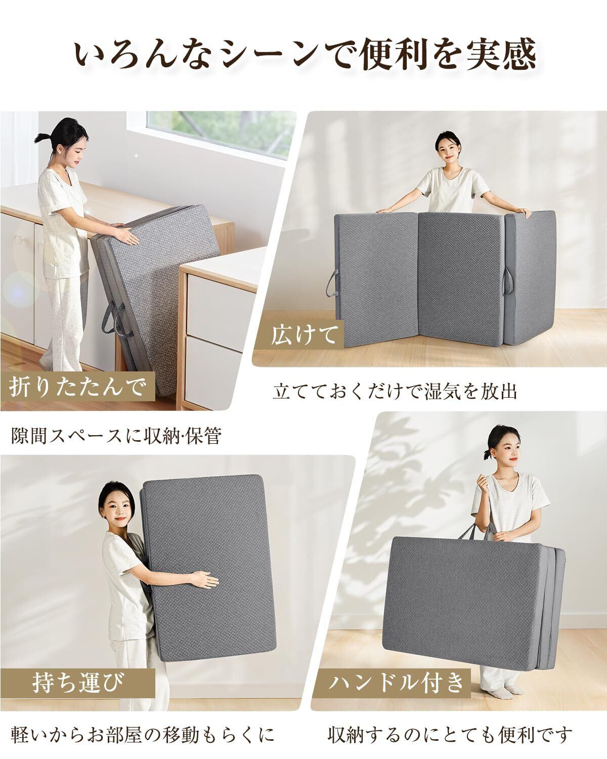 このマットレスは三つ折りにすることができ、使用しない際にはコンパクトに収納できます。スペースを有効に使えるため、普段使いや急な来客時にも大変便利です。